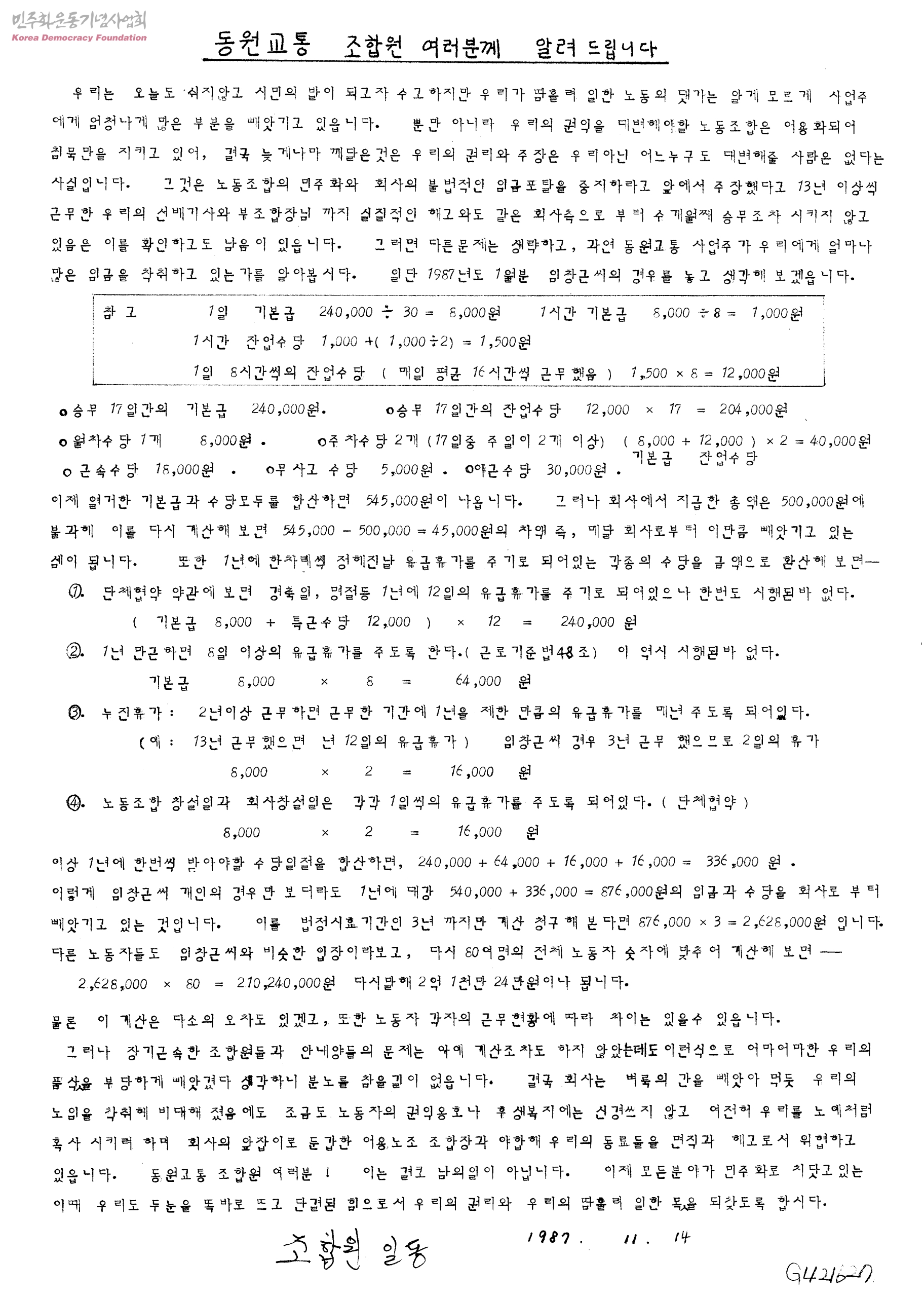 동원교통 조합원 여러분께 알려드립니다