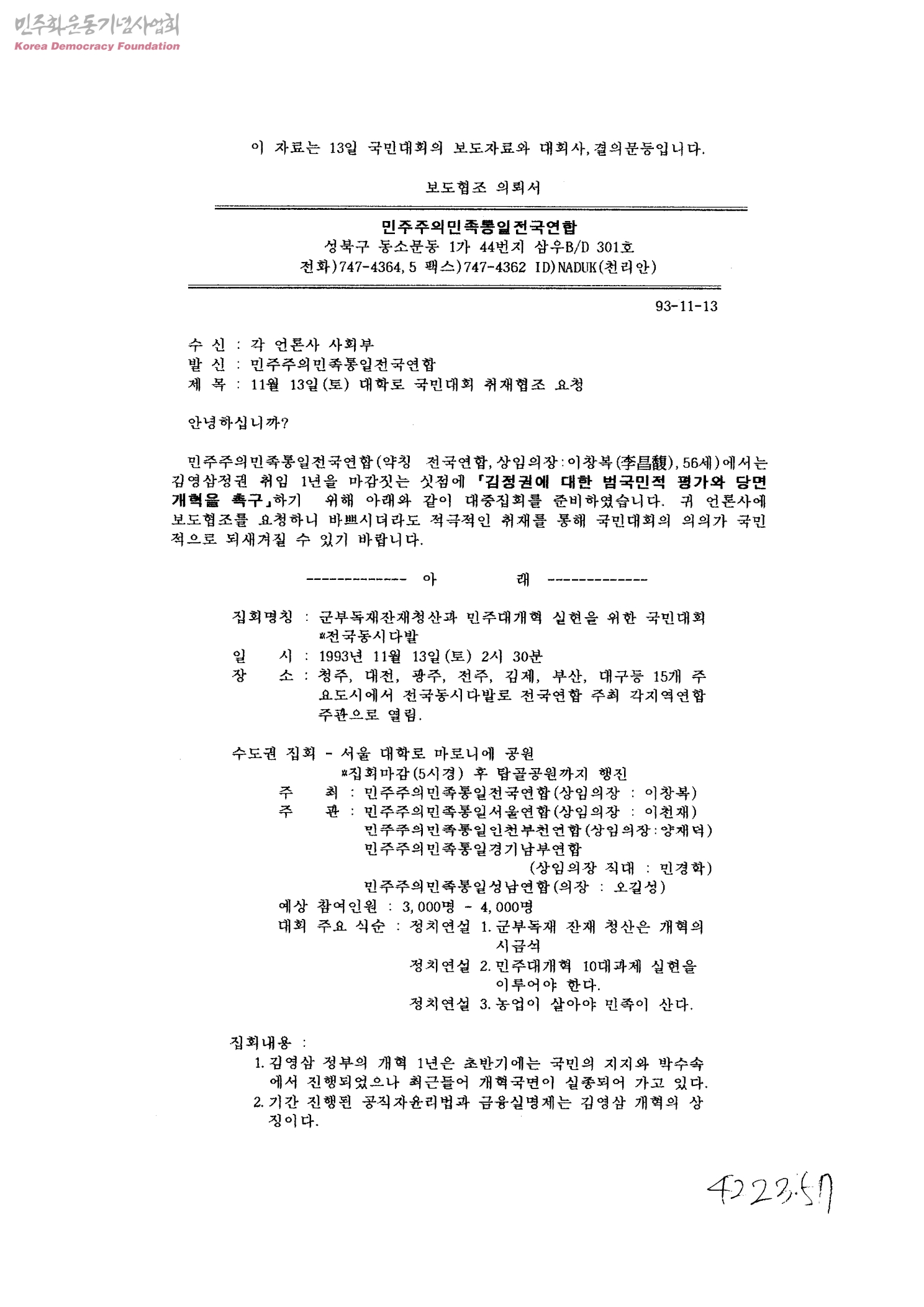 보도협조의뢰서-11월31일(토)대학로 국민대회 취재협조 요청[수신:각 언론사 사회부,발신:민주주의민족통일전국연합]