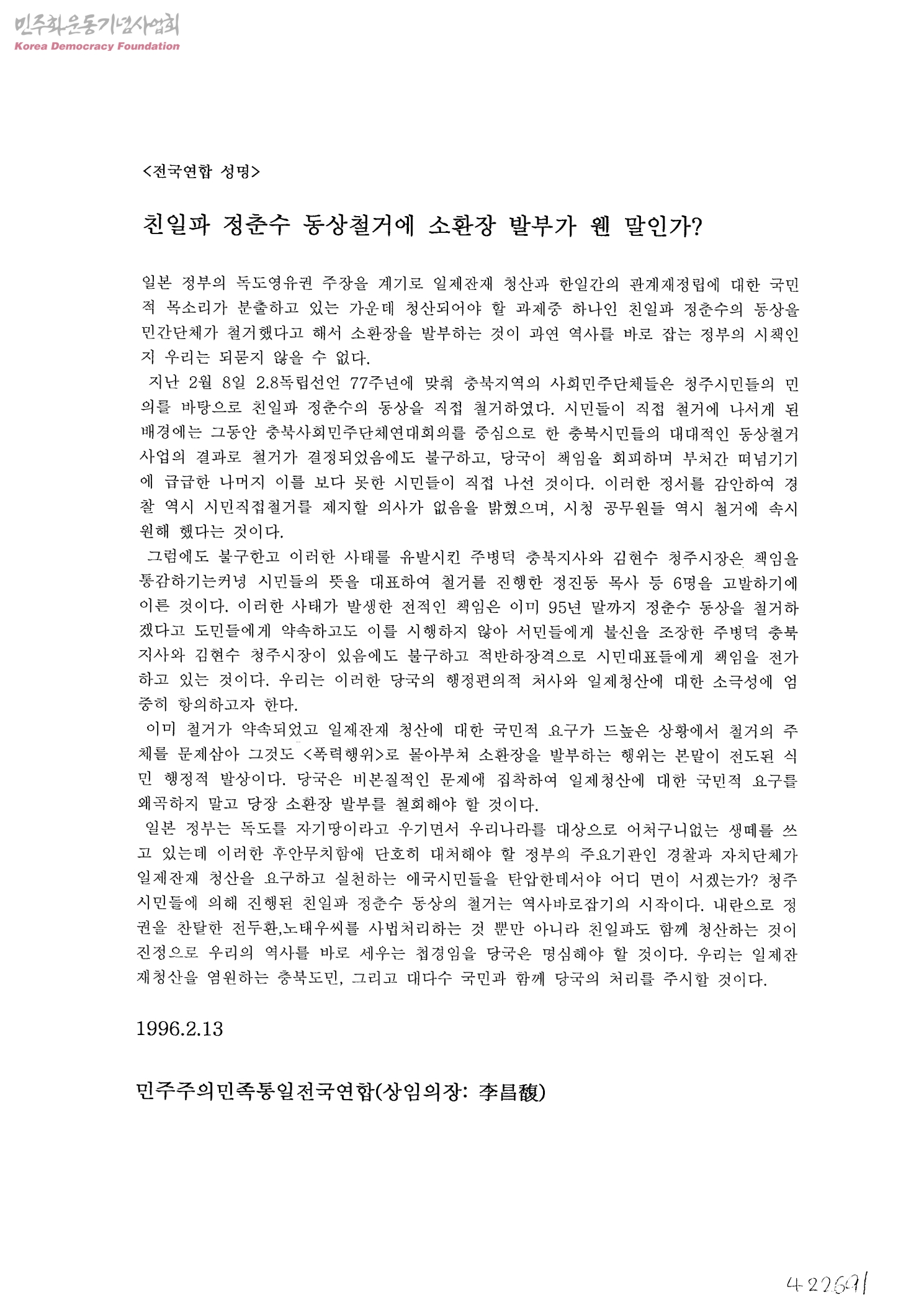 ['95 친일파정춘수동상철-충북지역사회민주단체연대회의관련]전국연합 성명 - 친일파 정춘수 동상철거에 소환장 발부가 웬말인가?