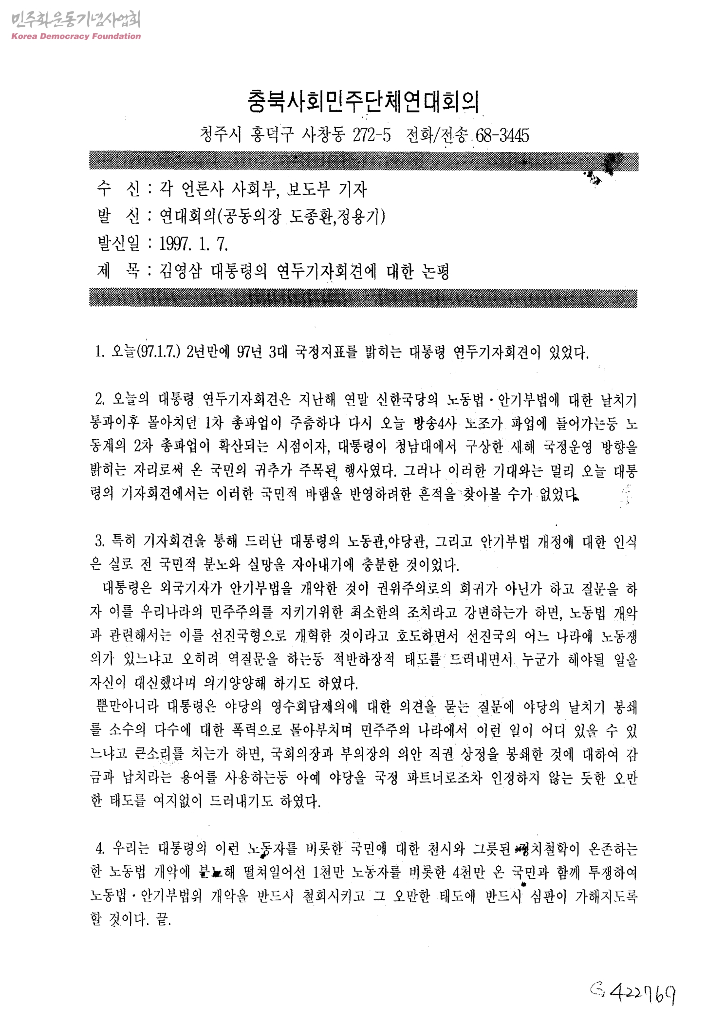 ['95 친일파정춘수동상철-충북지역사회민주단체연대회의관련]김영삼 대통령의 연두기자회견에 대한 논평[수신: 각 언론사 사회부,보도부 기자, 발신:연대회의(공동의장 도종환, 정용기)]