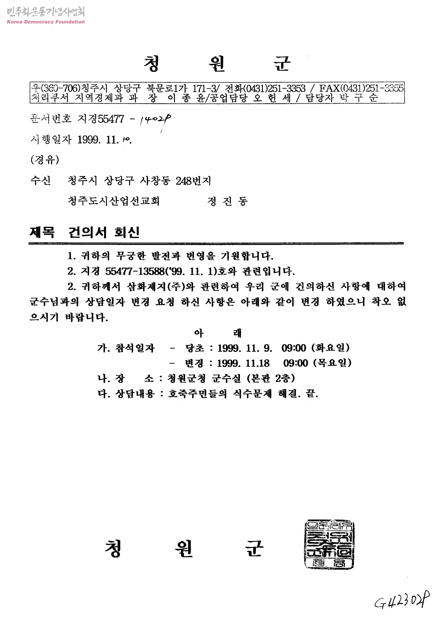 건의서 회신[호죽주민들의 식수문제 해결][수신:청주도시산업선교회 정진동,발신:청원군수]