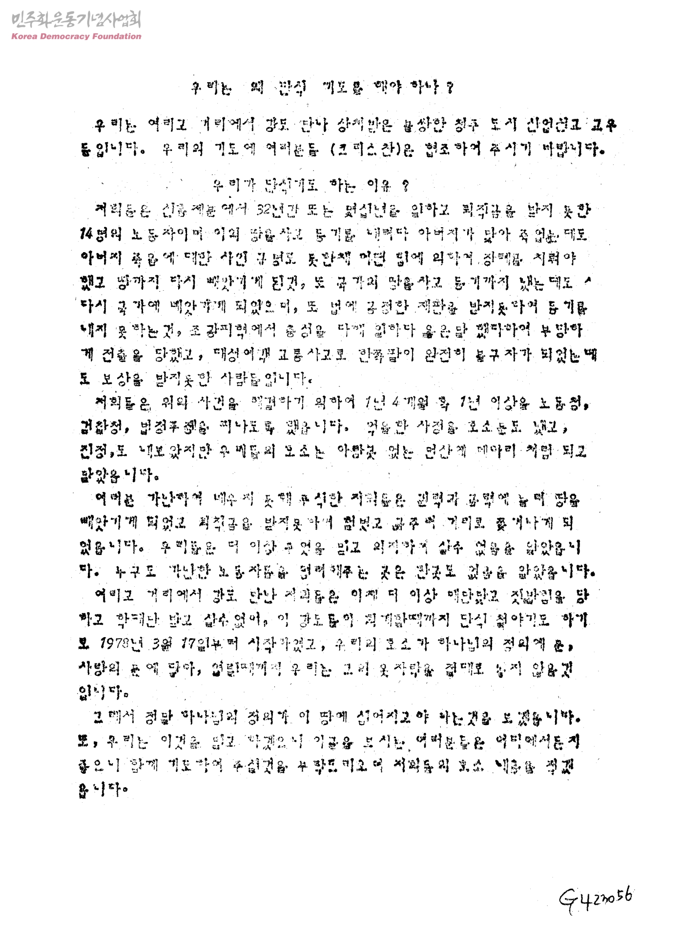 - 단식기도 제목 1.신흥제분은 근로자들에게 퇴직금을 지불하라 2.조광피혁은 김병하씨의 부당 전출을 철회하라 3.한텅동씨의 땅을 뺏은 국가는 즉시 땅은 반환하라 4.박창우씨가 구매한 땅에 대한 권리를 줘라 5.대성여객은 장애인이 된 박성세씨에 대한 보상을 하라 6.장월봉씨를 죽인 신만호를 엄벌하라