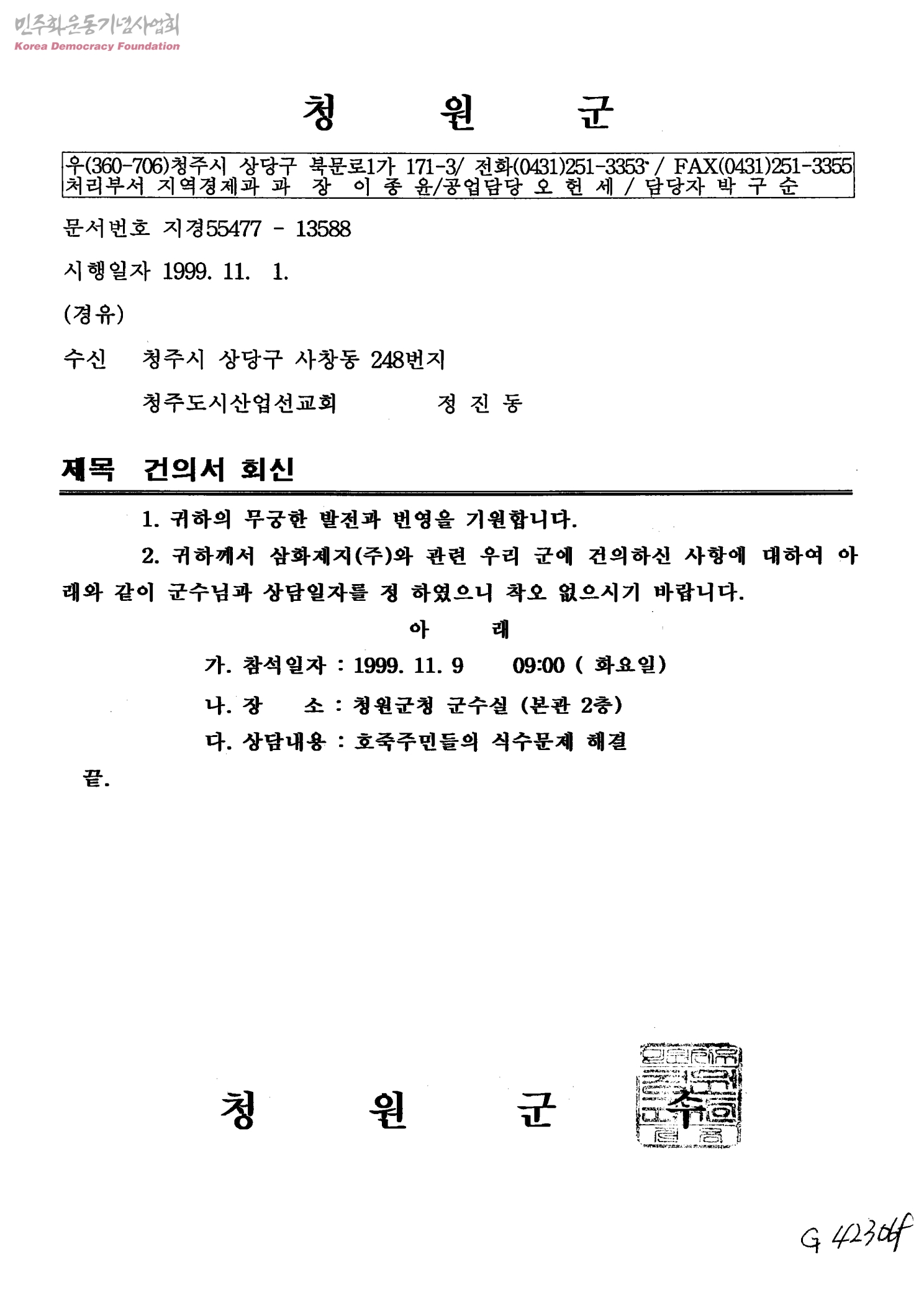건의서 회신[호죽주민들의 식수문제 해결][수신:청주도시산업선교회 정진동,발신:청원군수]