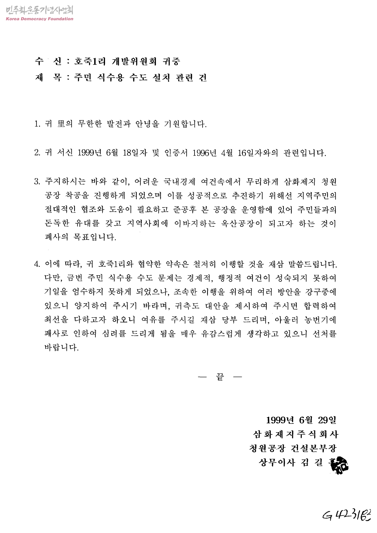 주민 식수용 수도 설치 관련 건[수신:호죽1리 개발위원회,발신:김길홍]