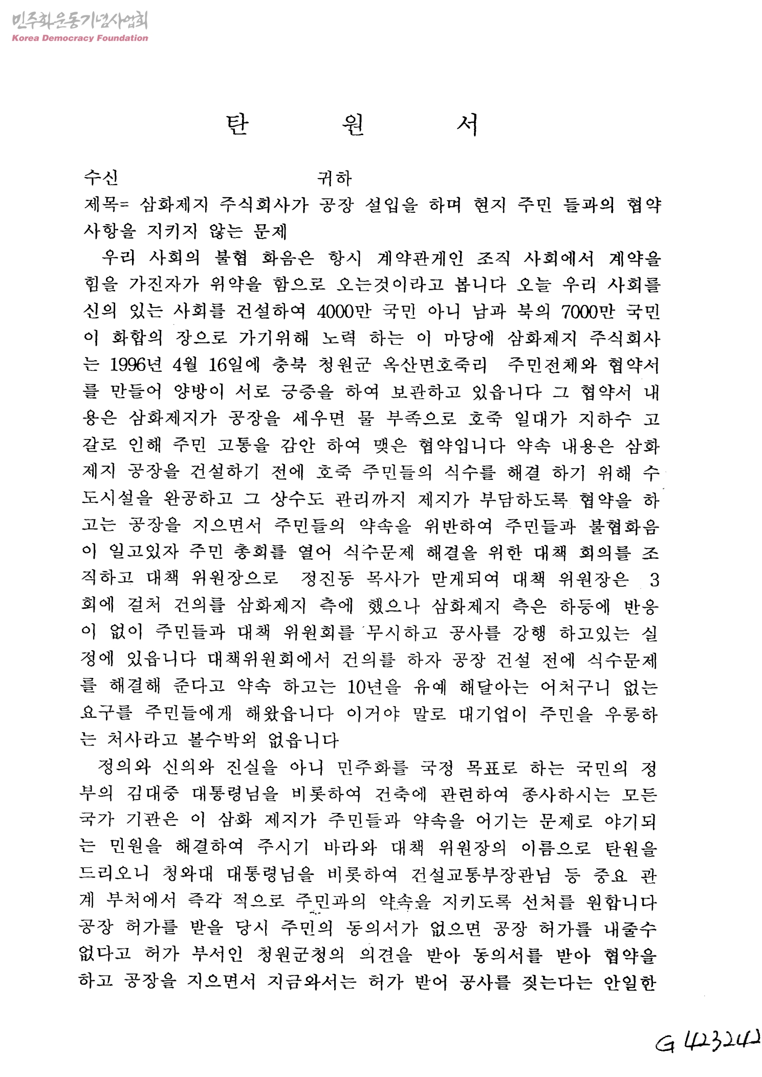 탄원서-삼화제지 주식회사가 공장 설입을 하며 현지 주민들과의 협약사항을 지키지 않는 문제