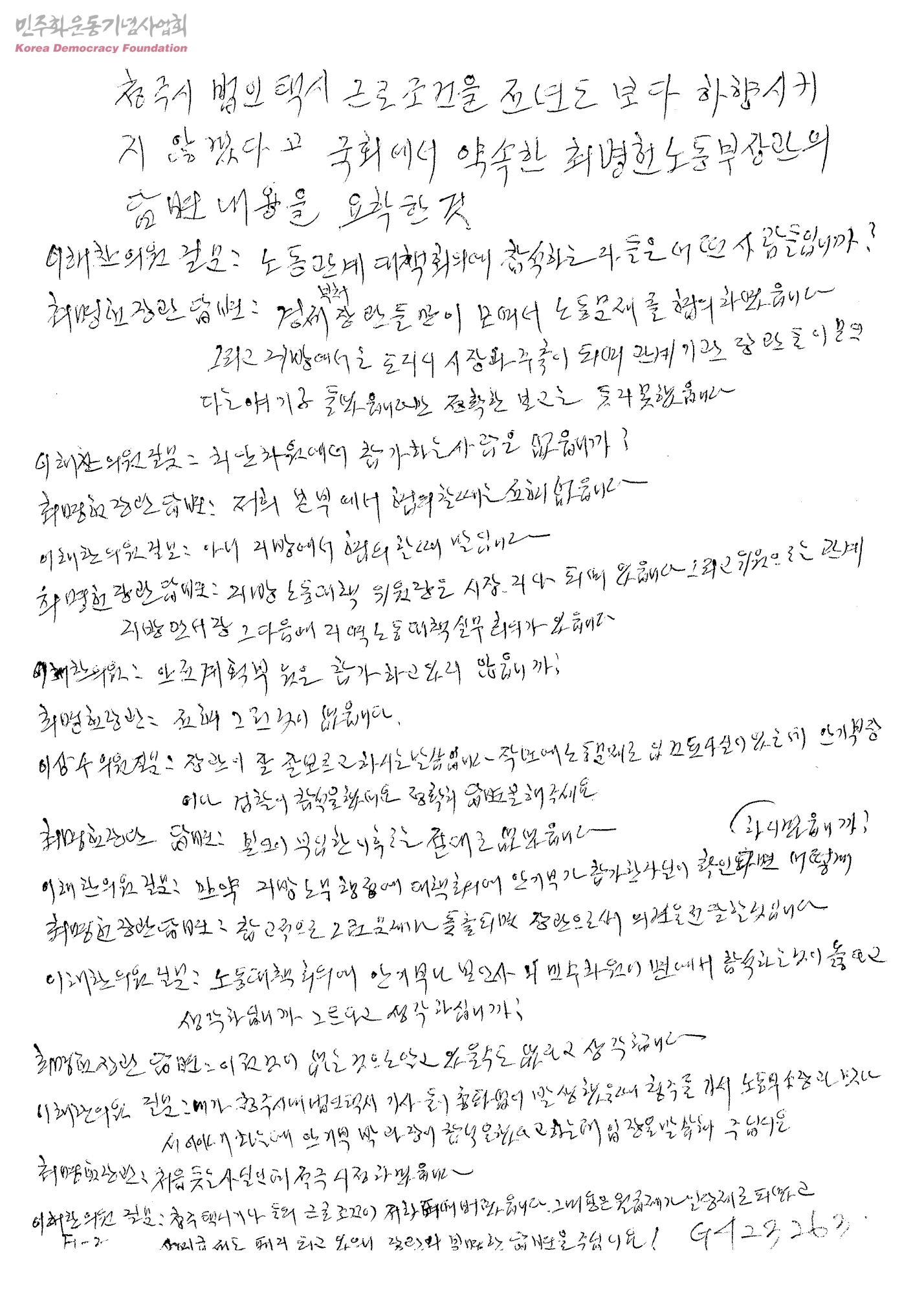 [국회속기록관련][청주시 법인택시 근로조건을 전년도 보다 하향시키지 않겠다고 국회에서 약속한 최병헌노동부장관의 답변내용 요약메모]