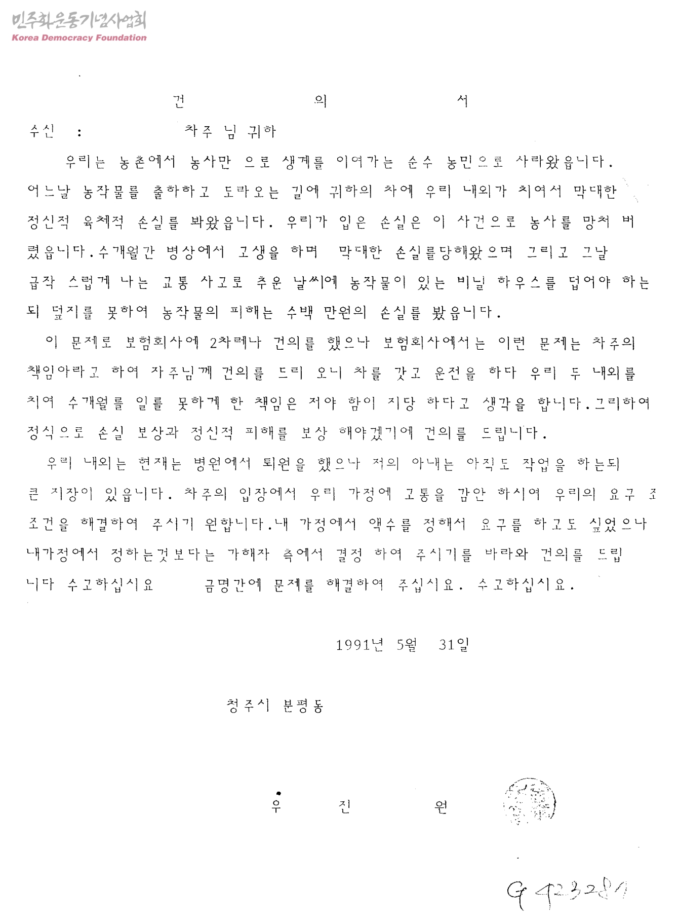[우진원새경운기교통사고관련]건의서[교통사고로 인한 피해보상]