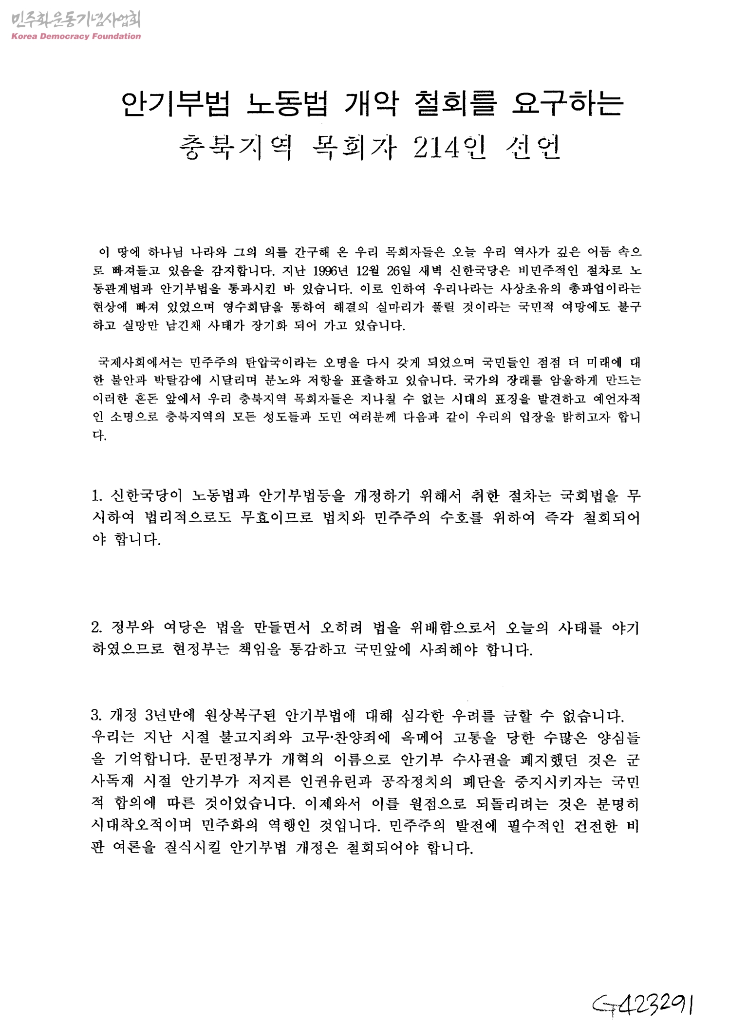 - 안기부법.노동법개악철회를위한충북지역목회자선언참가자214인