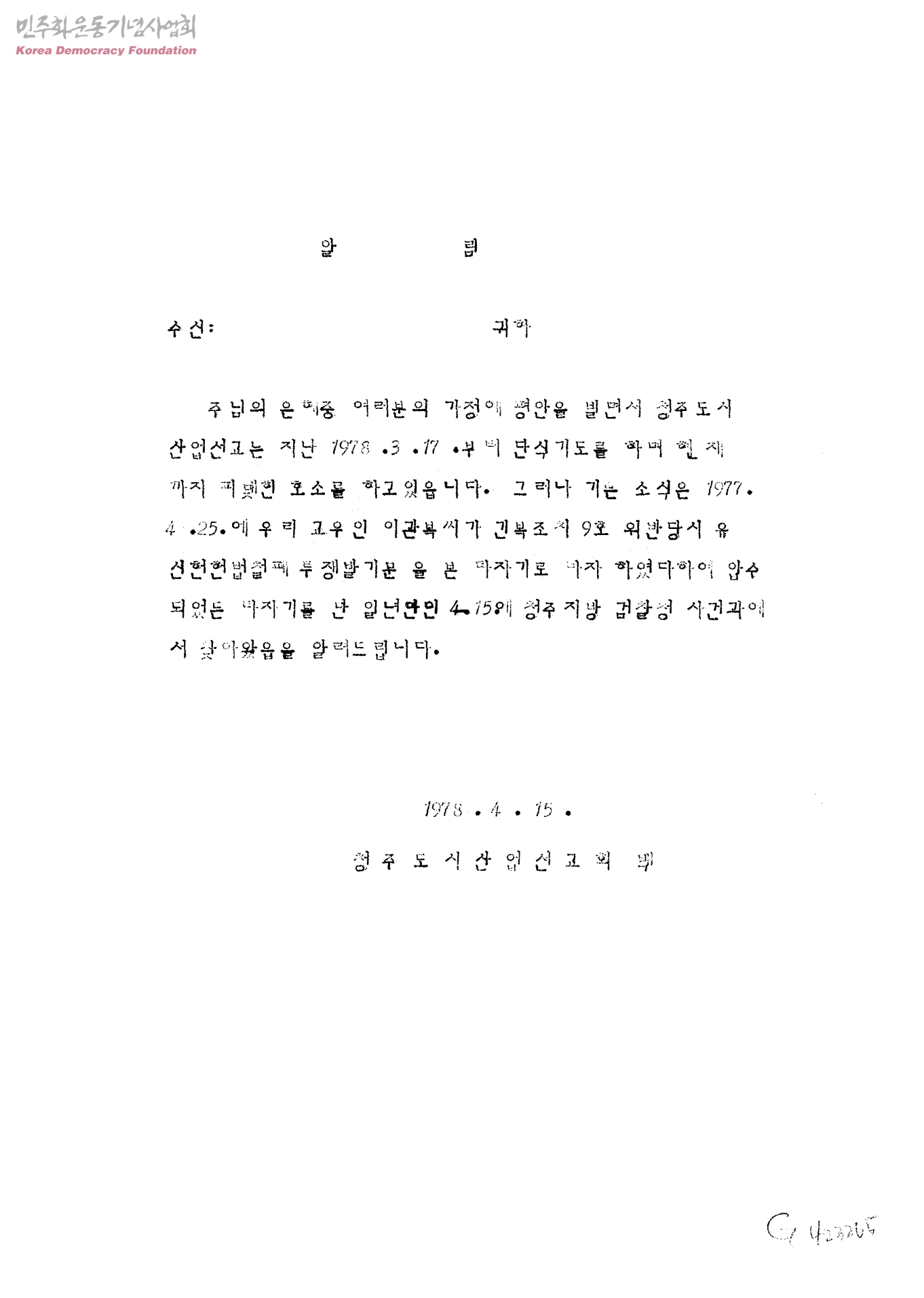 알림[이관복씨가 유신헌법철폐 투쟁발기문을 쓸때 사용한 타자기를 검찰청에서 찾아옴]