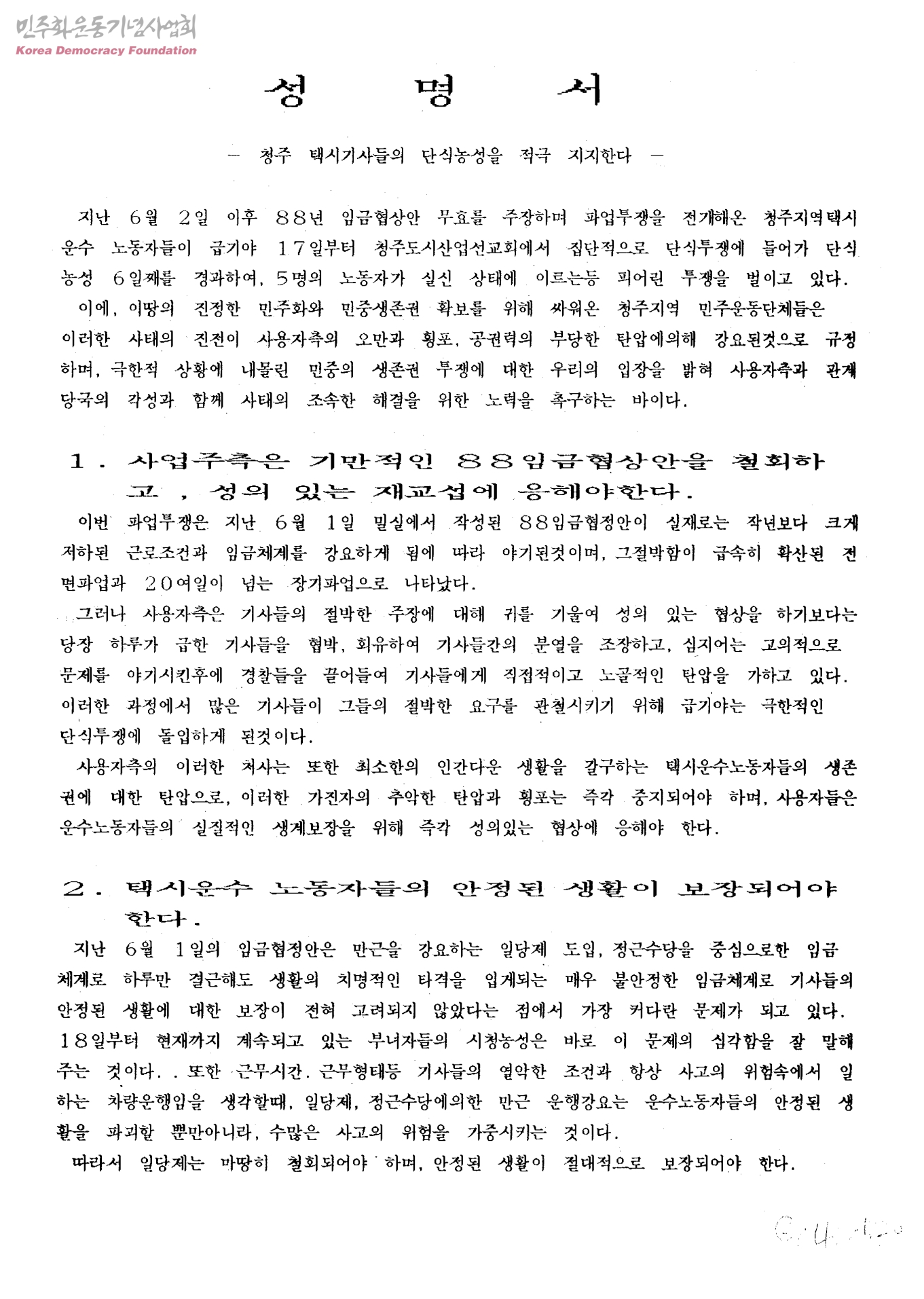- 1.사업주측은 기만적인 88임금협상안을 철회하고 성의 있는 재교섭에 응해야 한다 2.택시운수 노동자들의 안정된 생활이 보장되어야 한다 3.경찰은 부당하게 구속된 운수노동자들을 즉각 석방하라