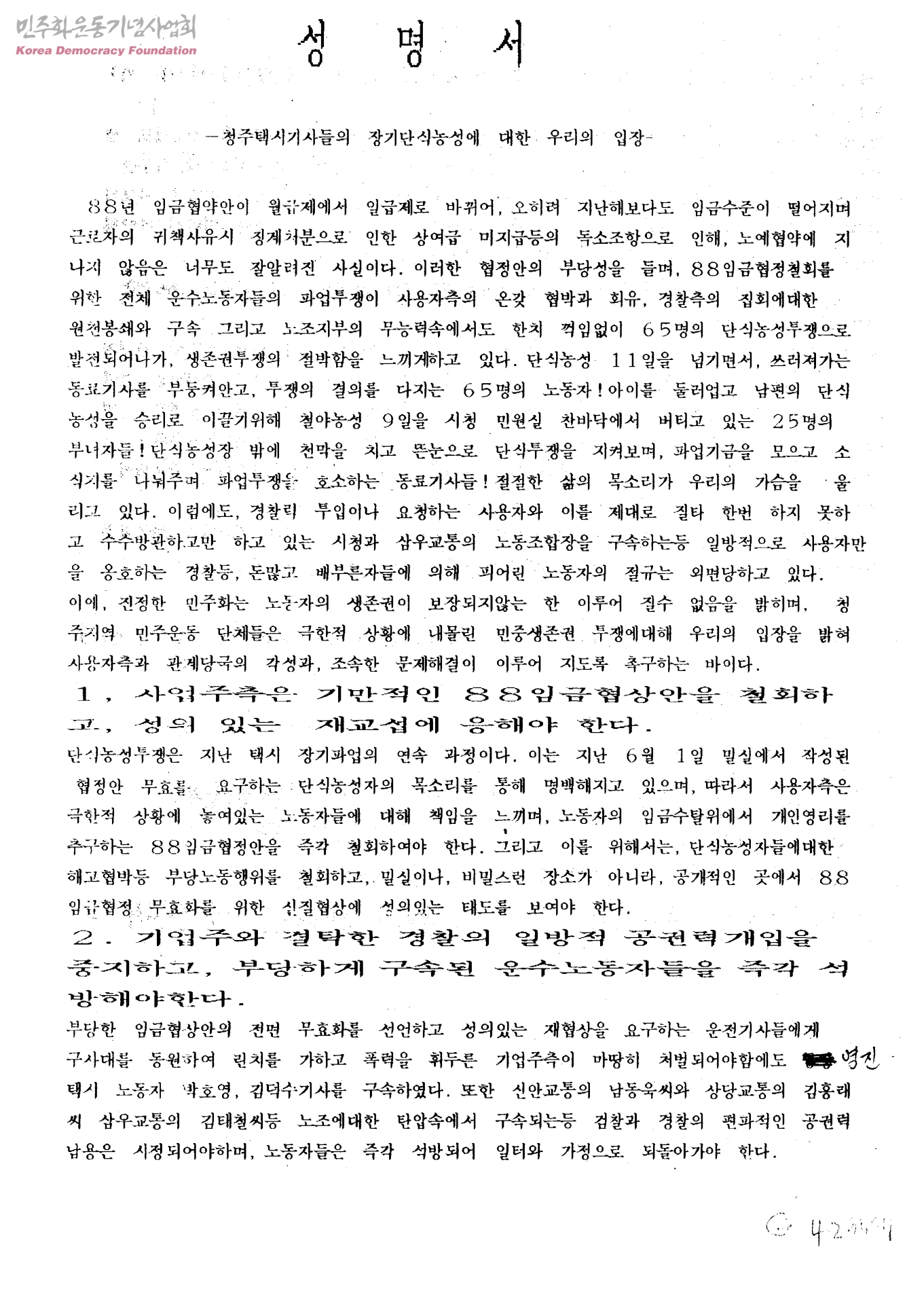 - 1.사업주측은 기만적인 88임금협상안을 철회하고 성의 있는 재교섭에 응해야 한다 2.기업주와 결탁한 경찰의 일방적 공권력개입을 중지하고 부당하게 구속된 운수노동자들을 즉각 석방해야 한다 3.택시 운수노동자들의 생활임금이 보장되어야 한다 4.노동자의 강고한 단결만이 정당한 권리를 보장쟁취할 수 있다