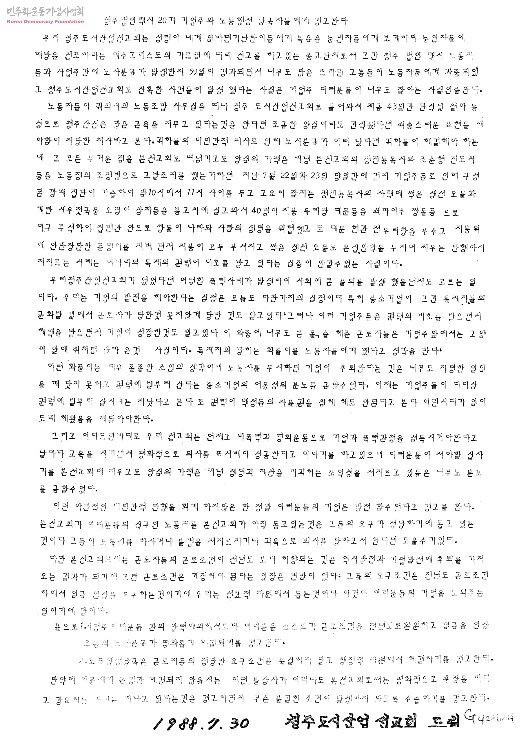 - 1.기업주 여러분들 관의 압력에 의해서보다 여러분들 스스로가 근로조건을 전년도로 환원하고 임금을 인상 오늘의 노사분규가 평화롭게 해결되기를 경고한다 2.노동행정당국은 근로자들의 정당한 요구조건을 묵살하지 말고 행정적 차원에서 해결하기를 경고한다