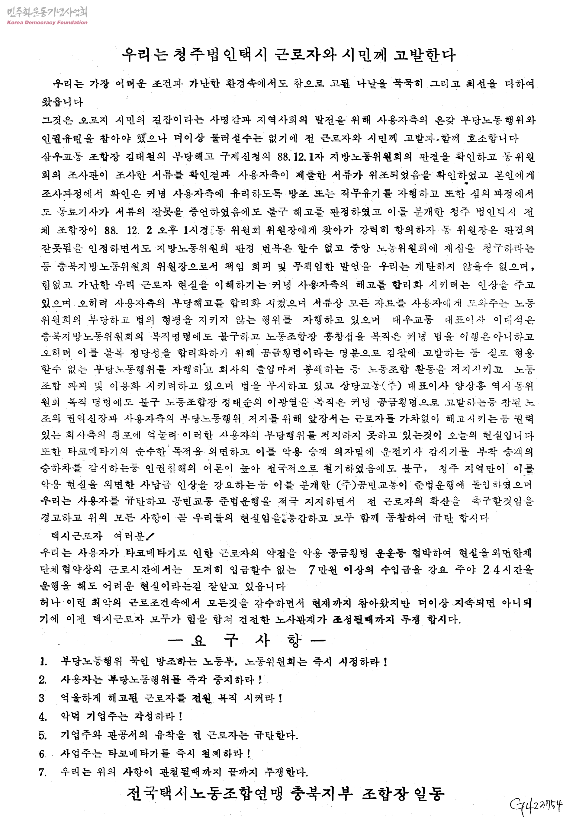 - 요구사항 1.부당노동행위 묵인 방조하는 노동부, 노동위원회는 즉시 시정하라 2.사용자는 부당노동행위를 즉각 중지하라 3.억울하게 해고된 근로자를 전원 복직 시켜라 4.악덕 기업주는 각성하라 5.기업주와 관공서의 유착을 전 근로자는 규탄한다 6.사업주는 타코메타기를 즉시 철폐하라 7.우리는 위의 사항이 관철될때까지 끝까지 투쟁한다