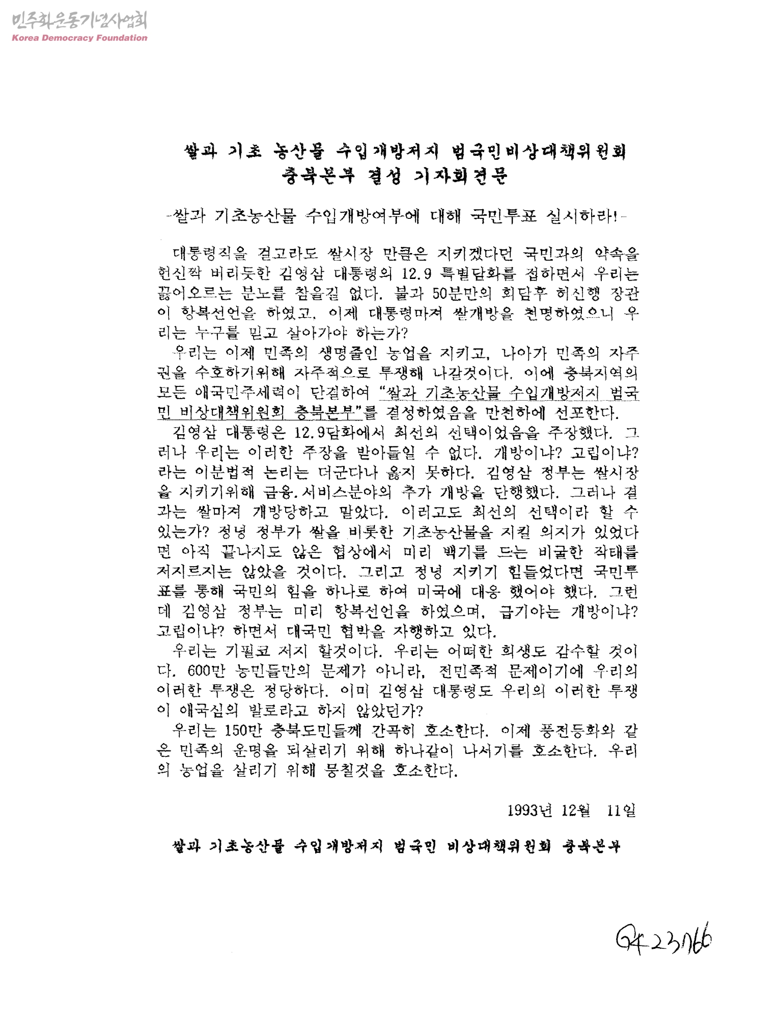 쌀과 기초 농산물 수입개방저지 범국민비상대책위원회 충북본부 결성 기자회견문