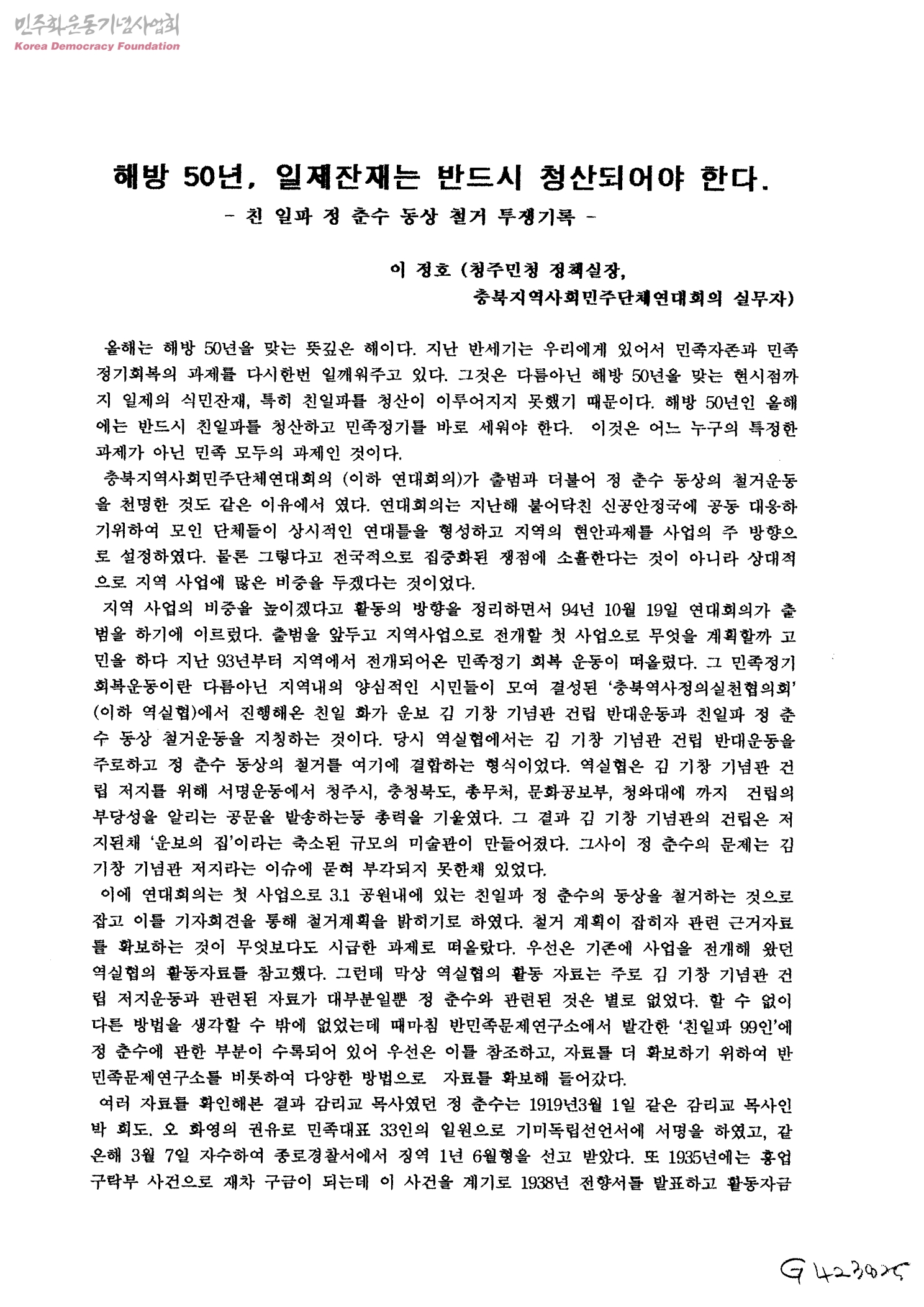 해방 50년, 일제잔재는 반드시 청산되어야 한다.-친 일파 정 춘수 동상 철거 투쟁기록