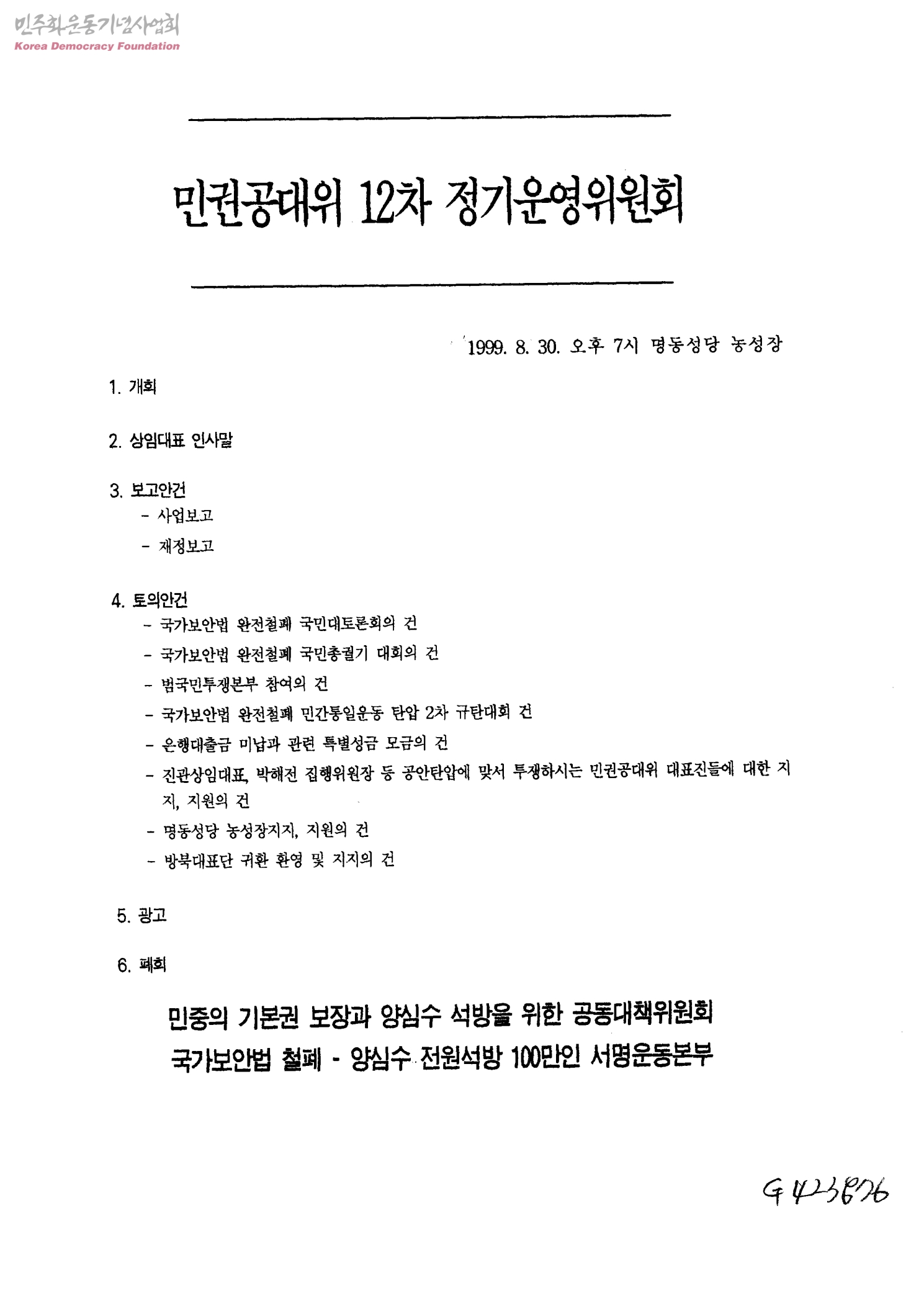 - [토의안건] 1.국가보안법 완전철폐 국민대토론회의 건 2.국가보안법 완전철폐 국민총궐기 대회의 건 3.범국민투쟁본부 참여의 건 4.국가보안법 완전철폐 민간통일운동 탄압 2차 규탄대회 건 5.은행대출금 미납과 관련 특별 성금 모급의 건 6.진관상임대표, 박해전 집행위원장 등 공안탄압에 맞서 투쟁하시는 민권공대위 대표진들에 대한 지지, 지원의 건 7.명동성당 농성장지지, 지원의 건 8.방북대표단 귀국 환영 및 지지의 건