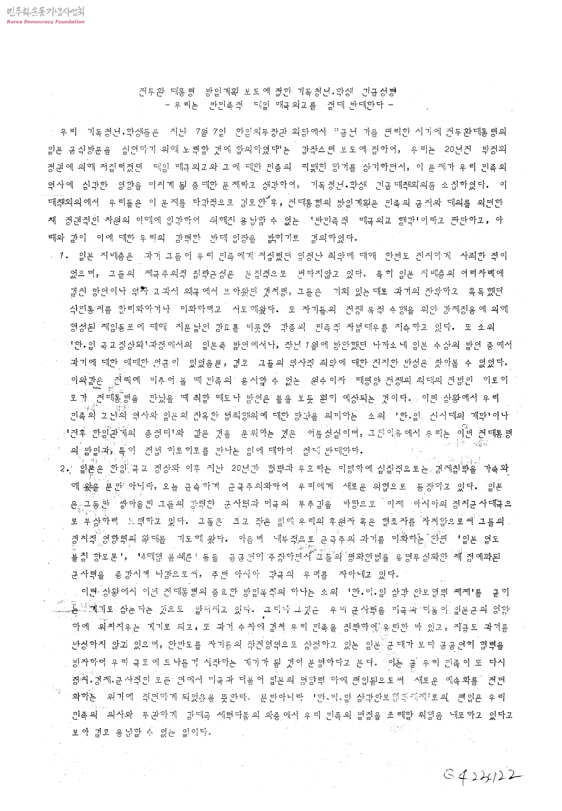 전두환대통령 방일계획 보도에 접한 기독청년.학생 긴급성명-우리는 반민족적 대일 매국외교를 절대 반대한다