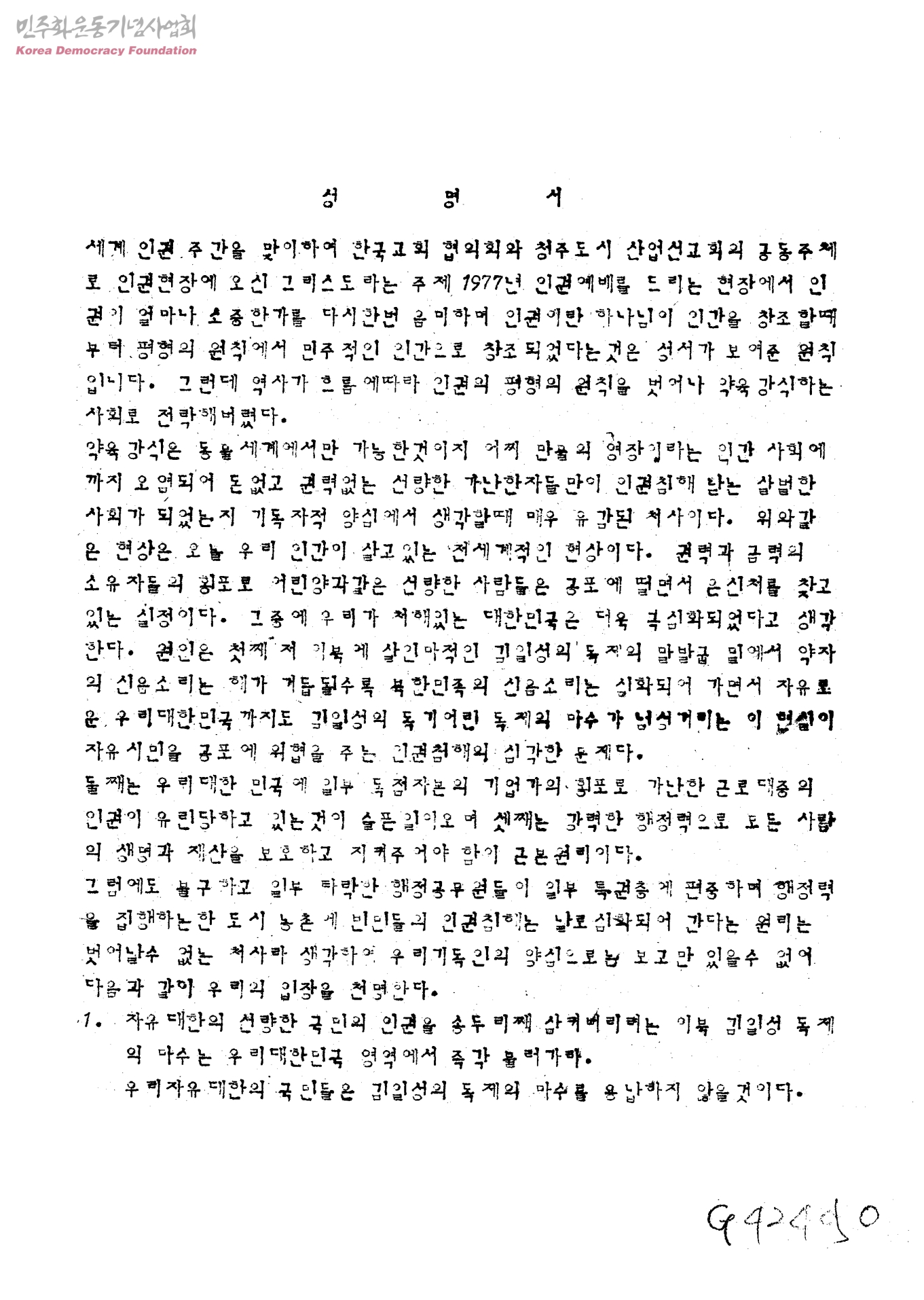 성명서[세계인권주간을 맞이한 청주도시산업선교회와 한국교회협의회의 공동성명서]