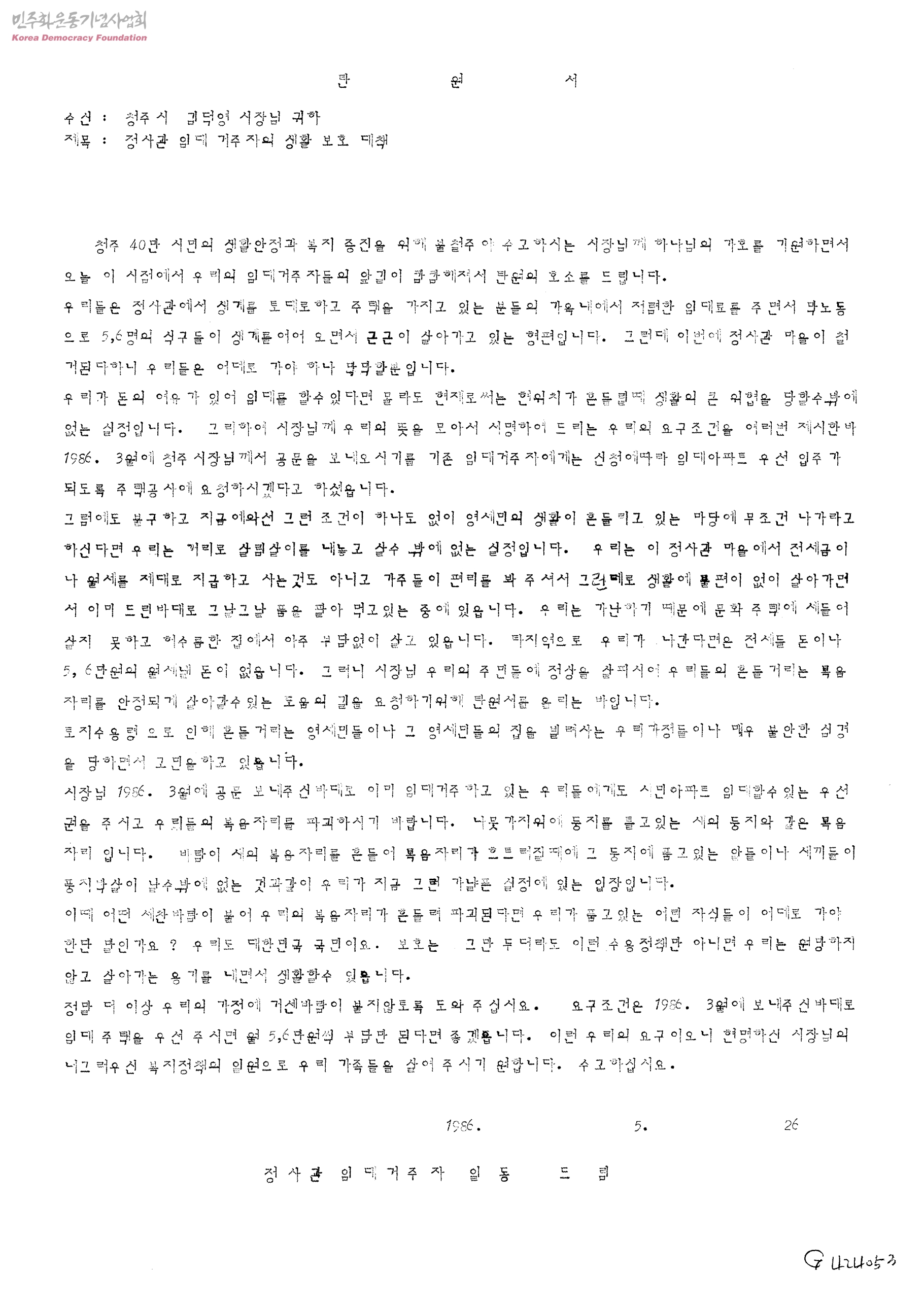 탄원서-정사관 임대 거주자의 생활보호 대책[수신:청주시김덕영시장님,발신: 정사관임대거주자일동]
