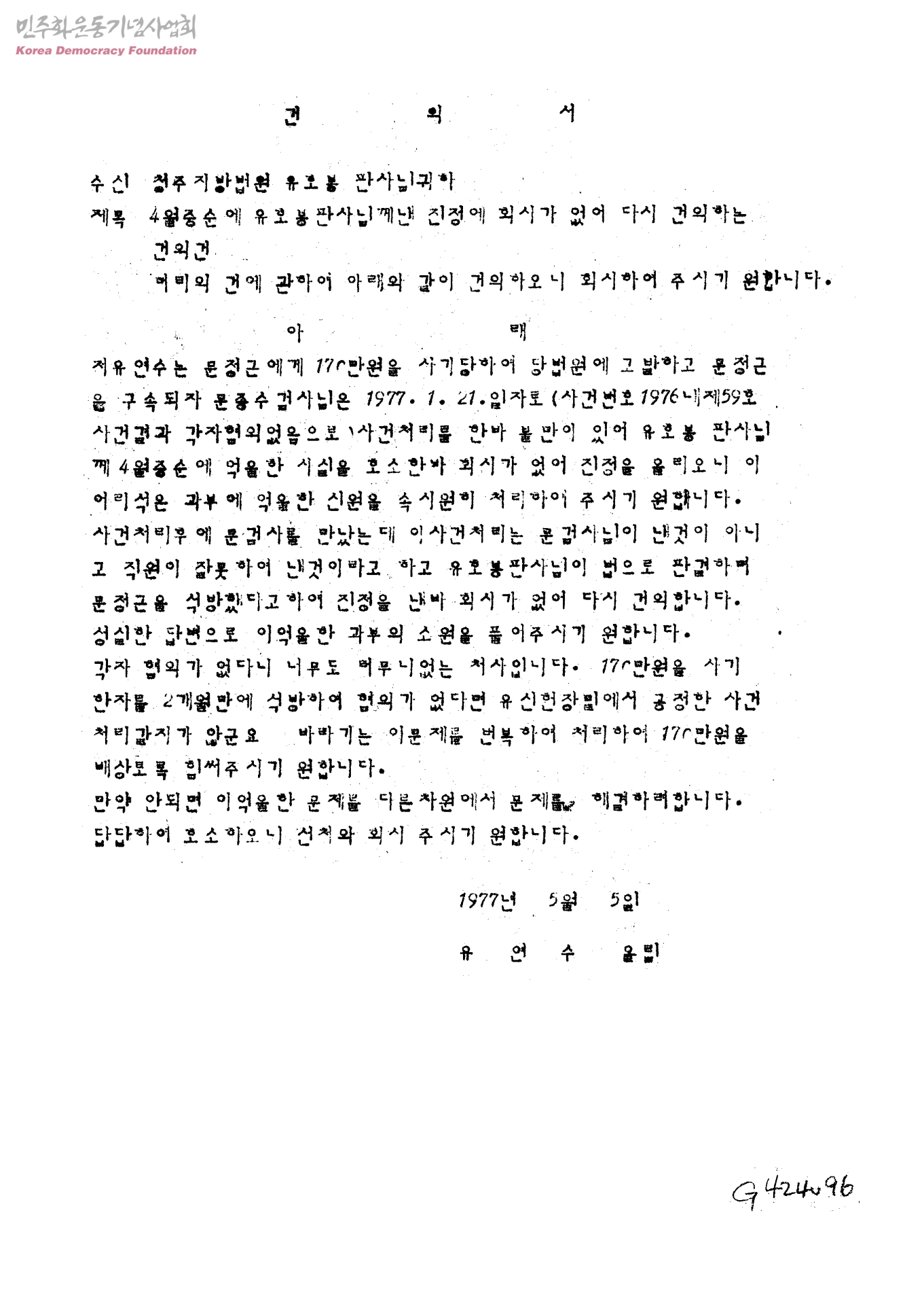 [원예협동조합 퇴직금관련]건의서- 4월 중순에 유호봉판사님께낸 진정에 회시가 없어 다시 건의하는 건의건[수신: 청주지방법원 유호봉 판사님]