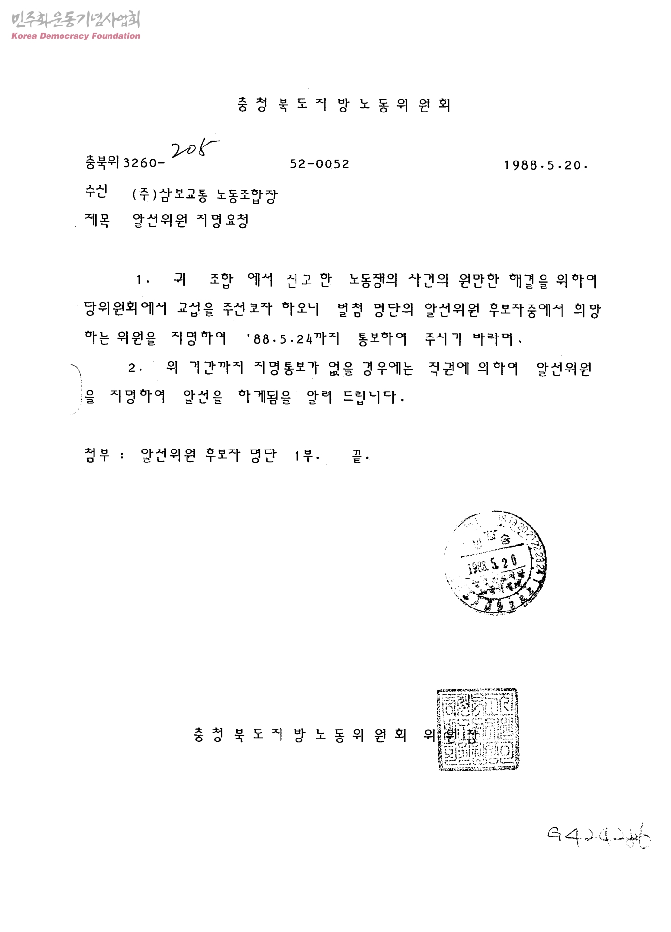 알선위원 지명요청[수신:(주)삼보교통 노동조합장]