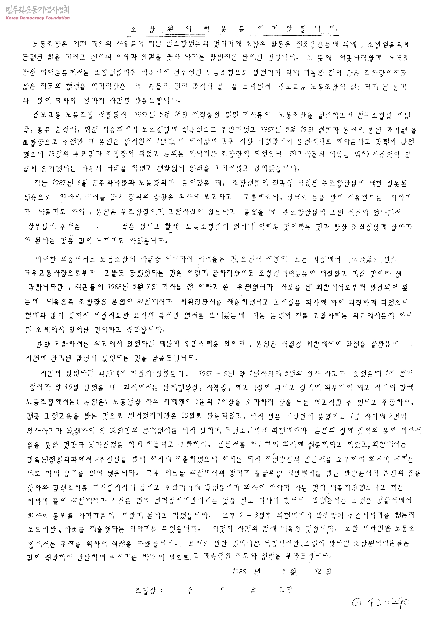 조합원 여러분들에게 알립니다[최현배씨 사건 관련 노동조합의 입장 해명]