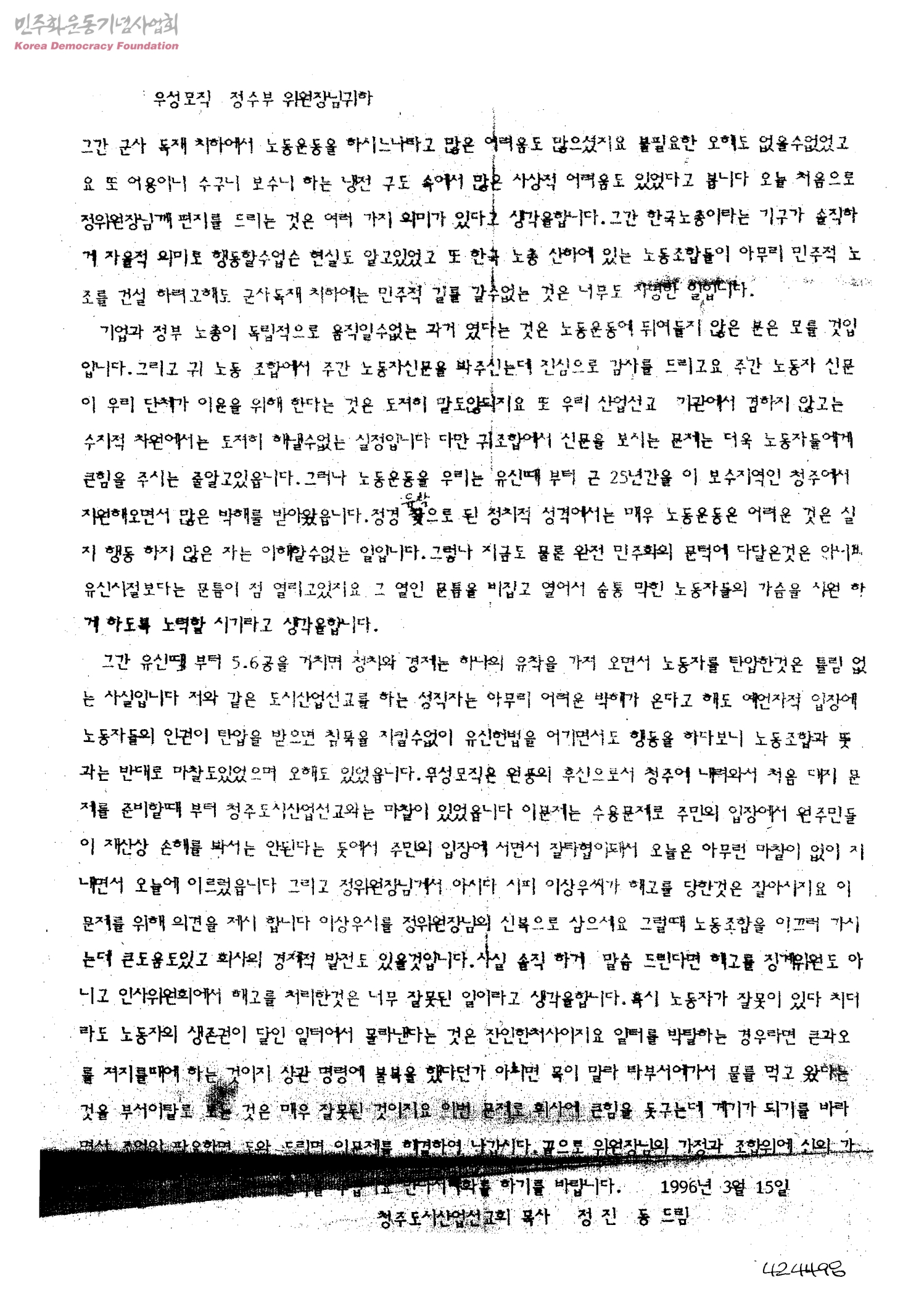 [청주도시산업선교회에서 우성모직 정수부 위원장에게 보내는 이상우씨 부당해고 관련 수발신 문서]