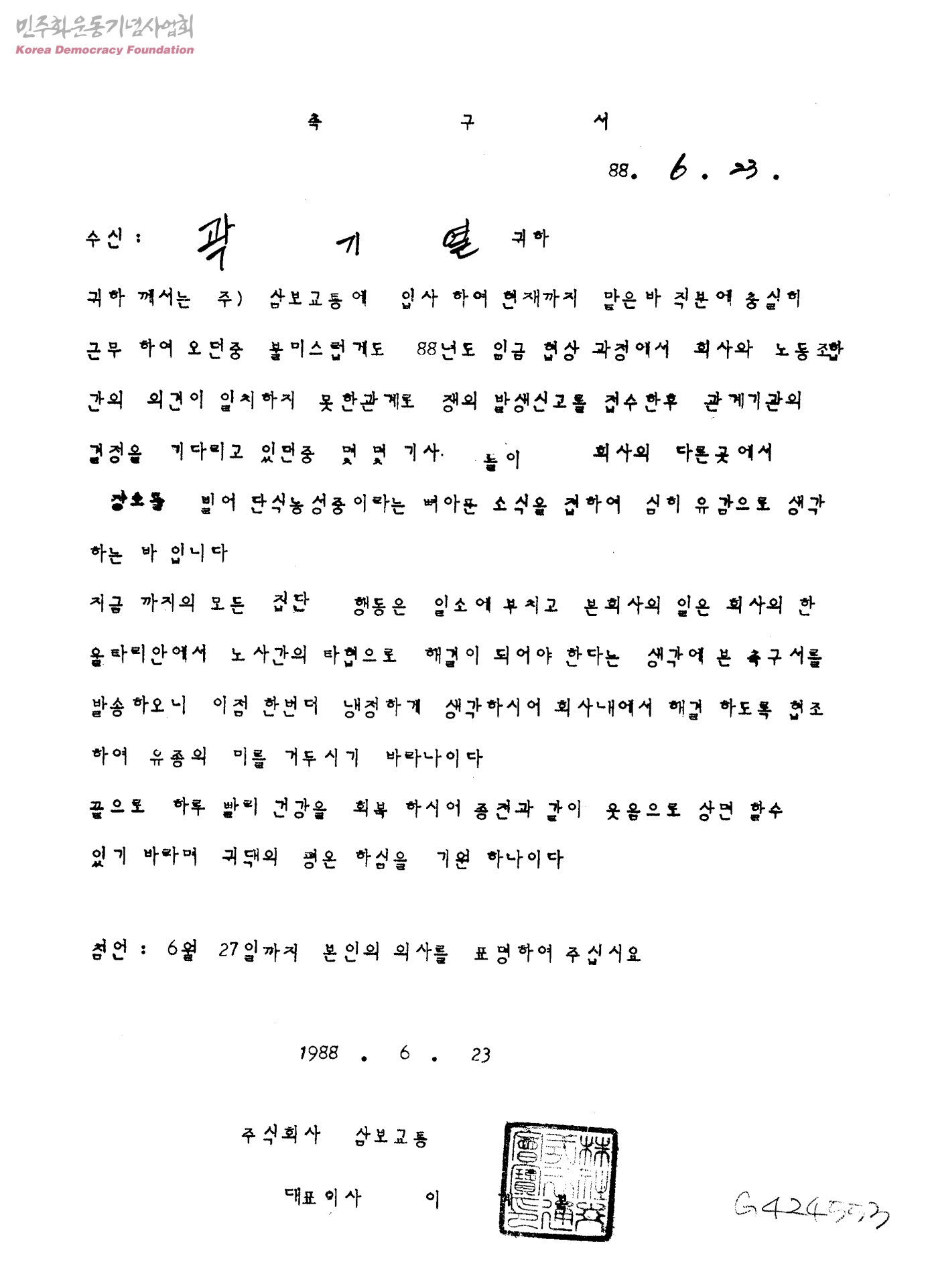 촉구서[수신:곽기열,발신:주식회사 삼보교통 대표이사 이계복]