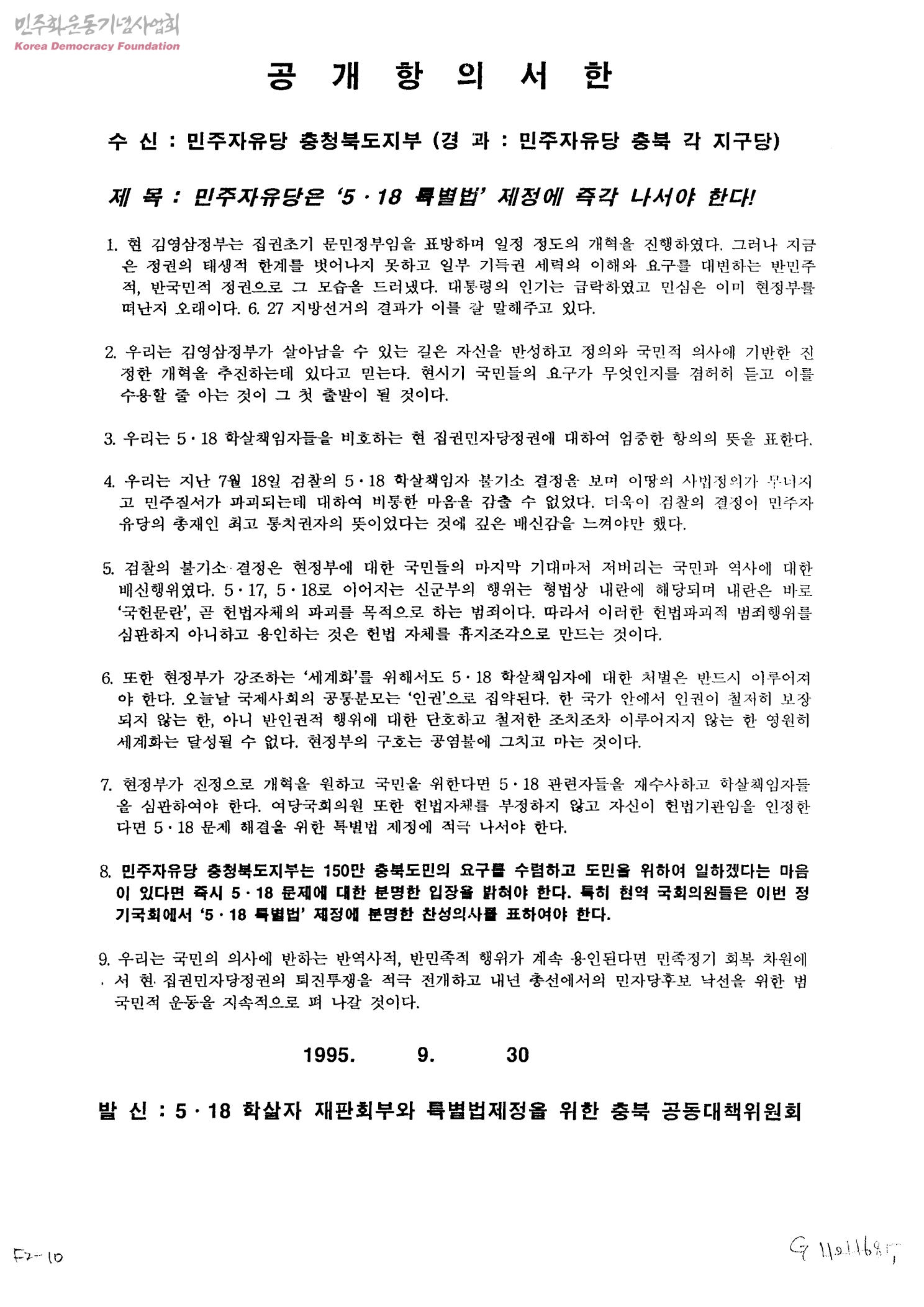 공개항의서한-민주자유당은 '5·18 특별법' 제정에 즉각 나서야 한다![수신:민주자유당충청북도지부,발신:5·18학살자재판회부와특별법제정을위한충북공동대책위원회]