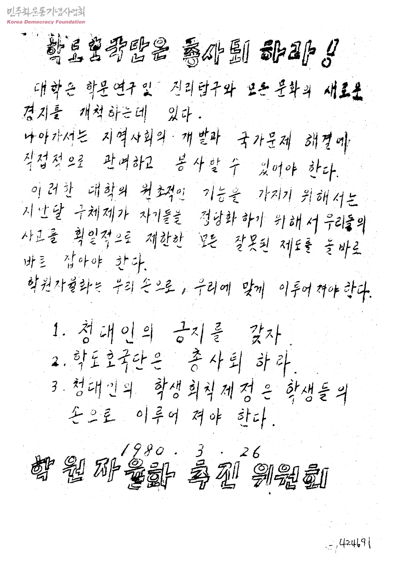 - 1.청대인의 긍지를 갖자 2.학도호국단은 총사퇴하라 3.청대인의 학생회칙제정은 학생들의 손으로 이루어져야 한다