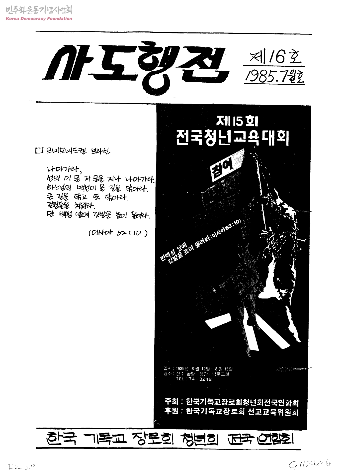 - 서대문 시론-'기청 대회' 10년을 돌아보며 씨알의 소리 젊은이의 함성-겸찰의 삼민투위 수사발표를 고발한다 특집-드디어 드러난 군부통치의 마각 독자투고-청년회 연합농촌활동을 다녀와서 예루살렘아! 예루살렘아!-기독교 새마을운동 전진대회의 실상 평화의 파수꾼