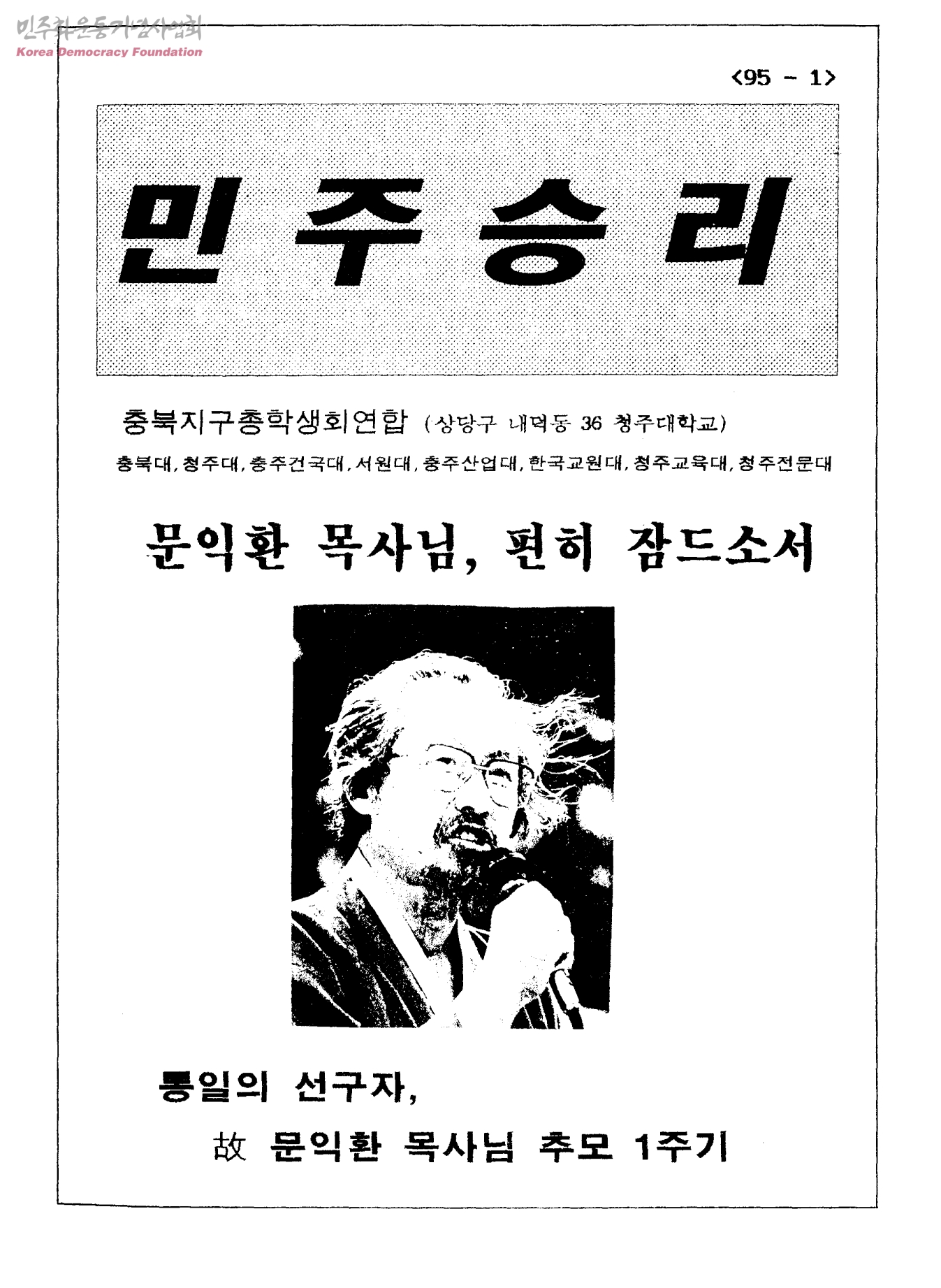 - 문익환 목사님, 편히 잠드소서 통일의 선구자, 故 문익환 목사님 추모 1주기 시민여러분! 1995년, 활기찬 한 해가 되기를 기원합니다 통일의 아버지 문익환 목사님의 유훈을 가슴깊이 새겨 우리 청년학생들은 통ㅇ리 1세대라는 자신감으로 95년 통일시대를 열어나가겠습니다 국가보안법 철폐와 양심수 석방으로 95년의 통일을 힘차게 맞이 합시다