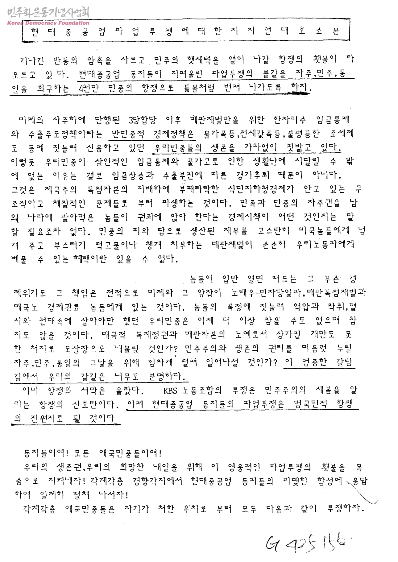 [울산현대중공업관련]현대중공업파업투쟁에대한지지연대호소문