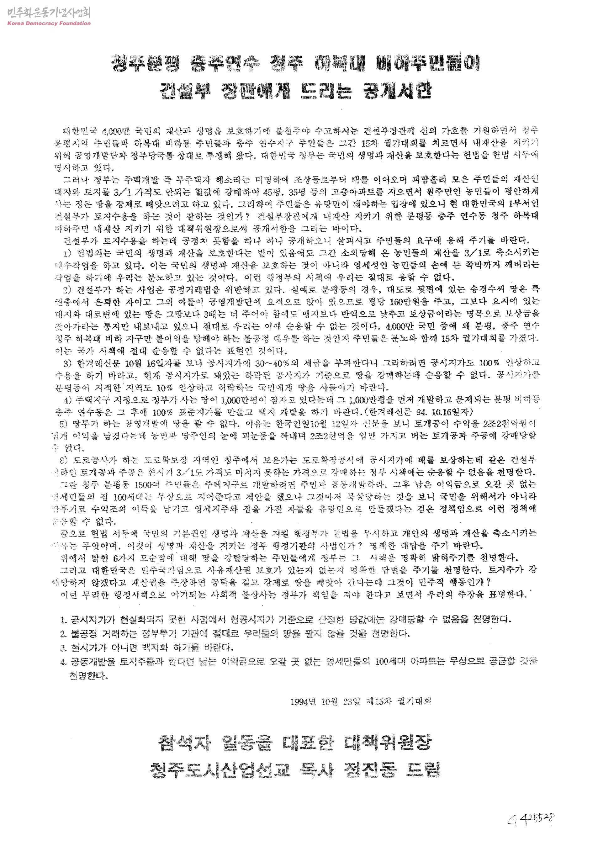 청주분평 충주연수 청주 하복대 비하주민들이 건설부 장관에게 드리는 공개서한