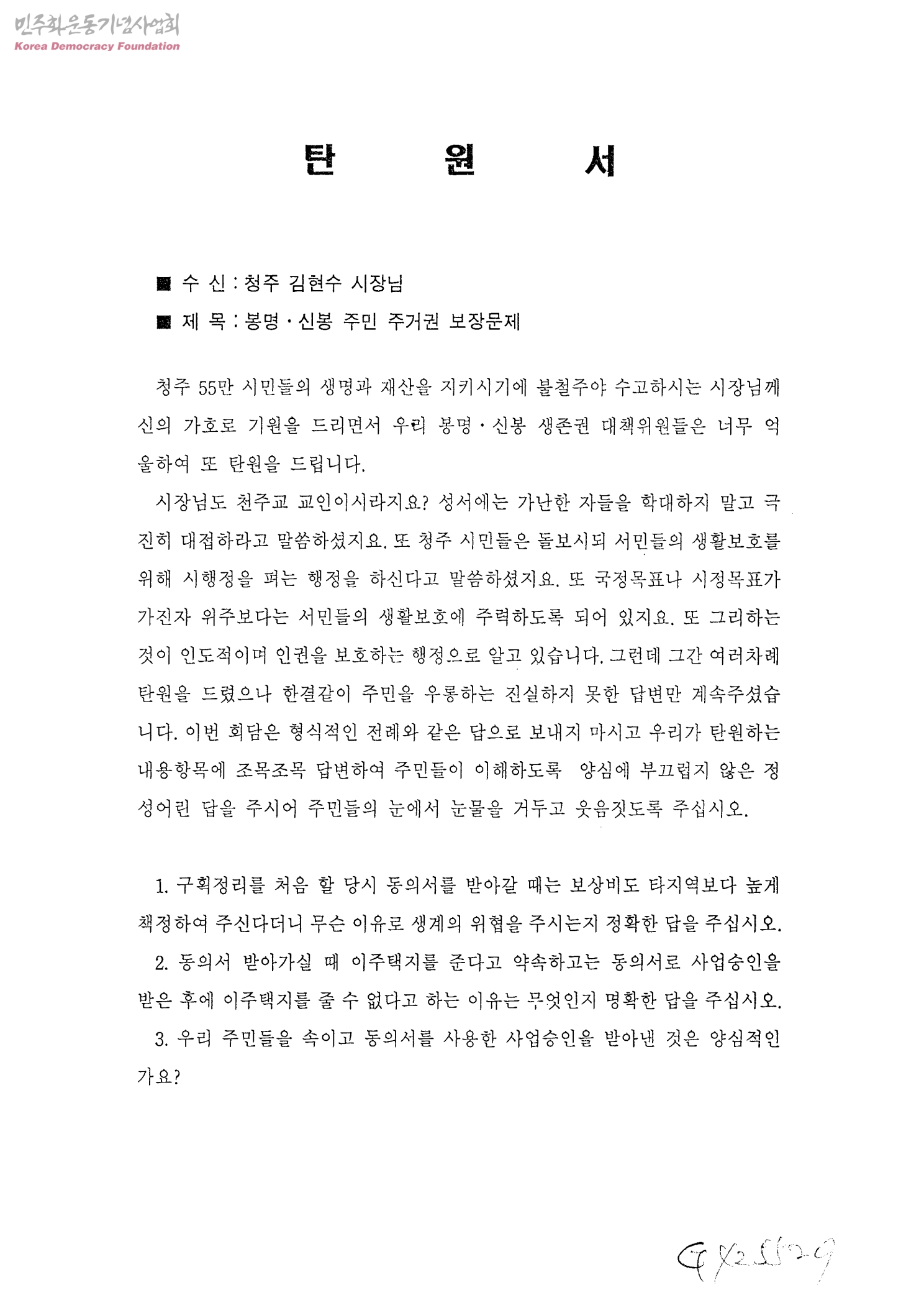 [신봉동주민관련]탄원서-봉명·신봉 주민 주거권 보장문제[수신:청주 김현수 시장님,발신:봉명신봉생존권대책위원회]