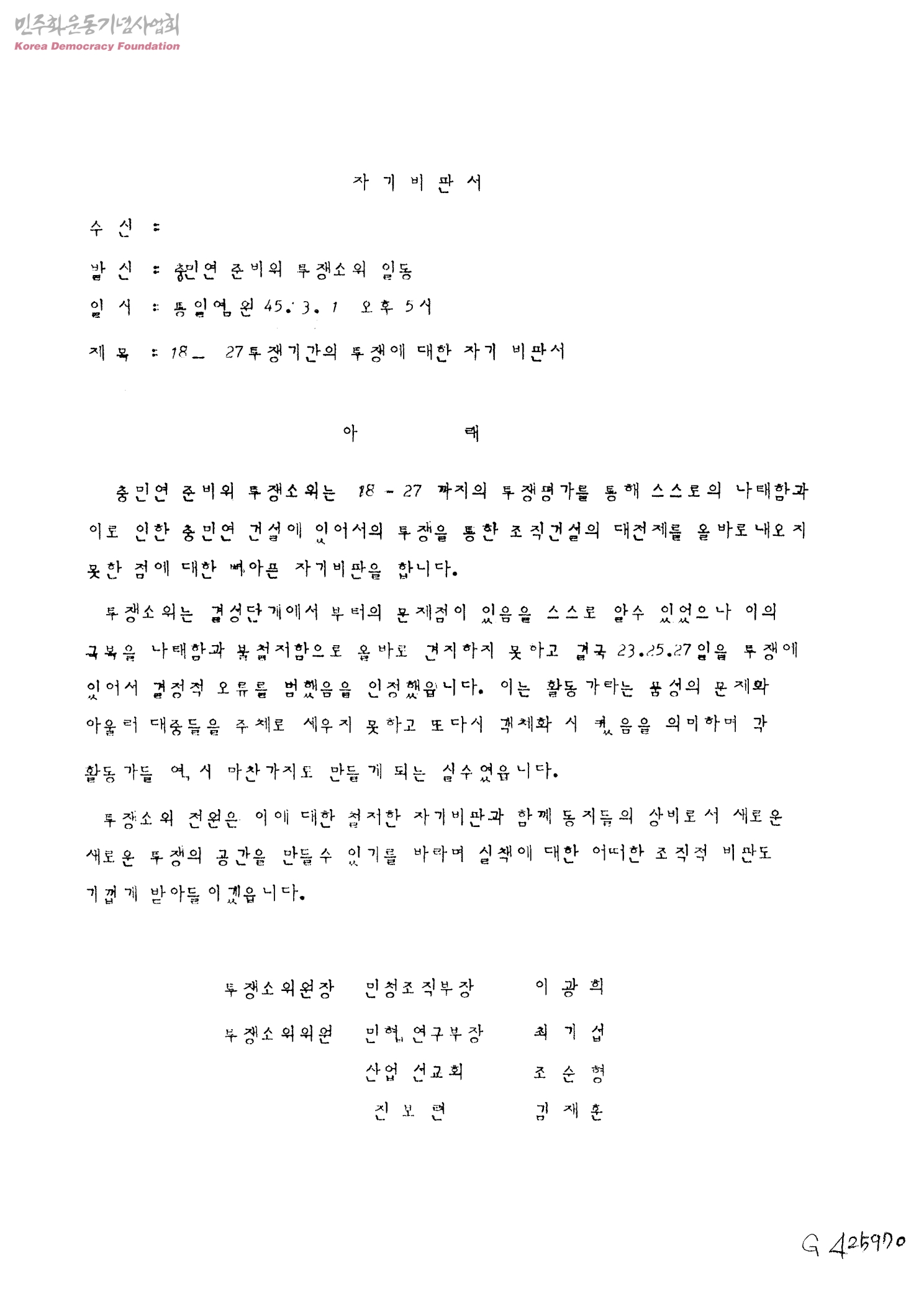 자기비판서- 18일~27일 투쟁기간의 투쟁에 대한 자기 비판서