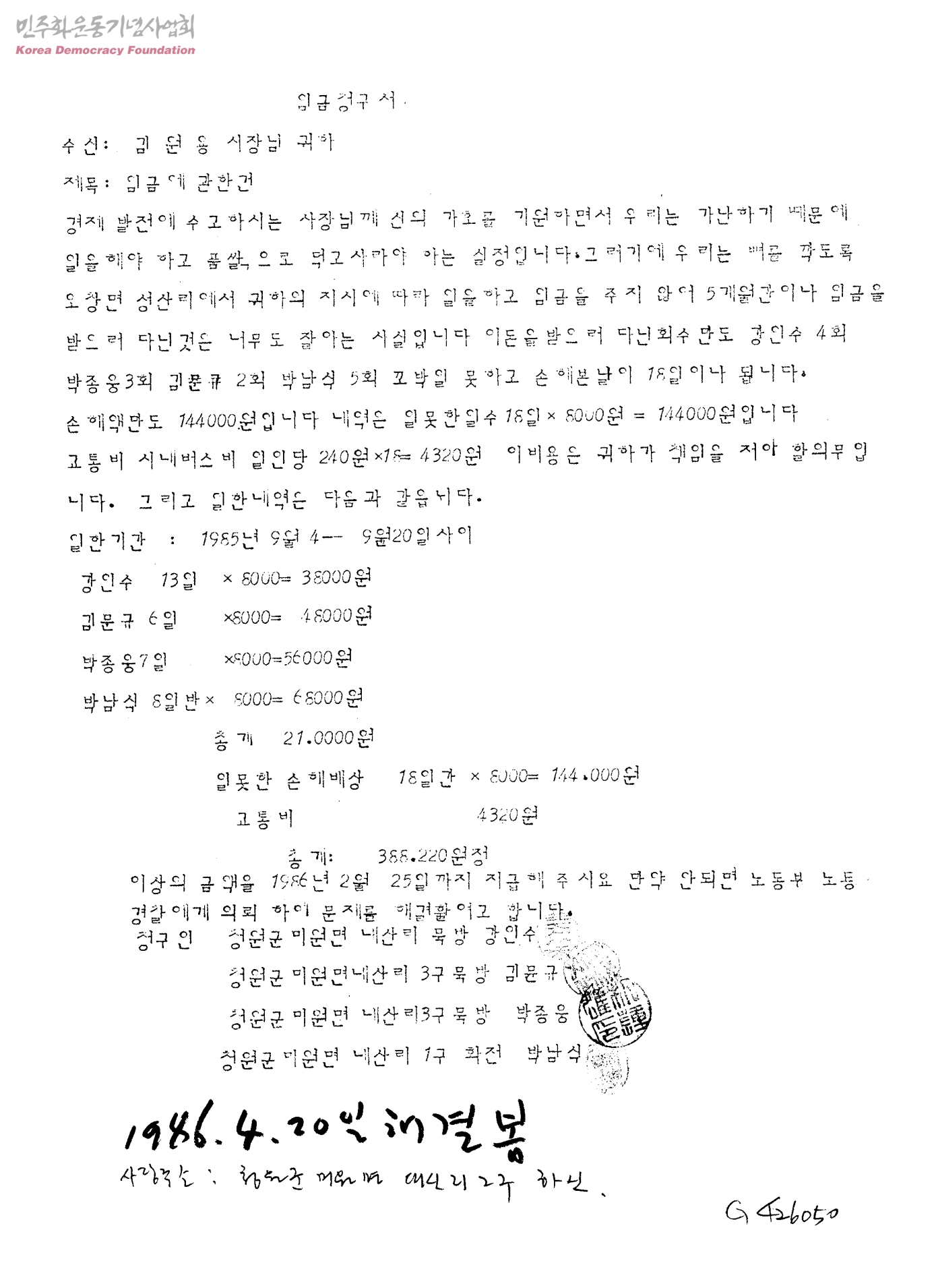[미원 강인수씨 노임문제 관련자료][임금에 관한 임금청구서][수신:김원용 사장님, 발신:강인수, 김문규, 박종웅, 박남식]