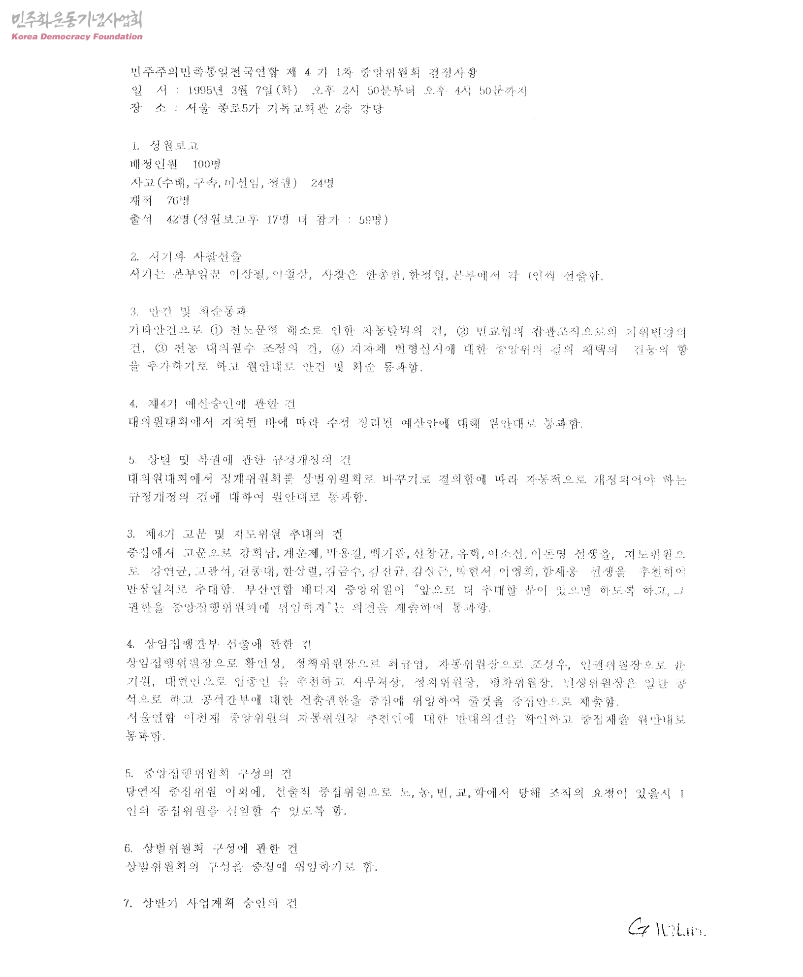 - 1.성원의 건 2.서기와 사찰선출 3.안건 및 회순통과 4.제4기 예산승인에 관한 건 5.상벌 및 복권에 관한 규정개정의 건 6.제4기 고문 및 지도위원 추대의 건 7.상임집행간부 선출에 관한 건 8.중앙집행위원회 구성의 건 9.상벌위원회 구성에 관한 건 10.상반기 사업계획 승인의 건 11.지자체선거 대응 사업계획 승인에 관한 건 12.지자체 선거준비위원회 명칭변경 및 체제정비에 관한 건 13.전노문협 해소에 따른 자동탈퇴의 건 14.민교협의 조직내 지위변경에 관한 건 15.전농 대의원 수 조정의 건 16.결의문 채택