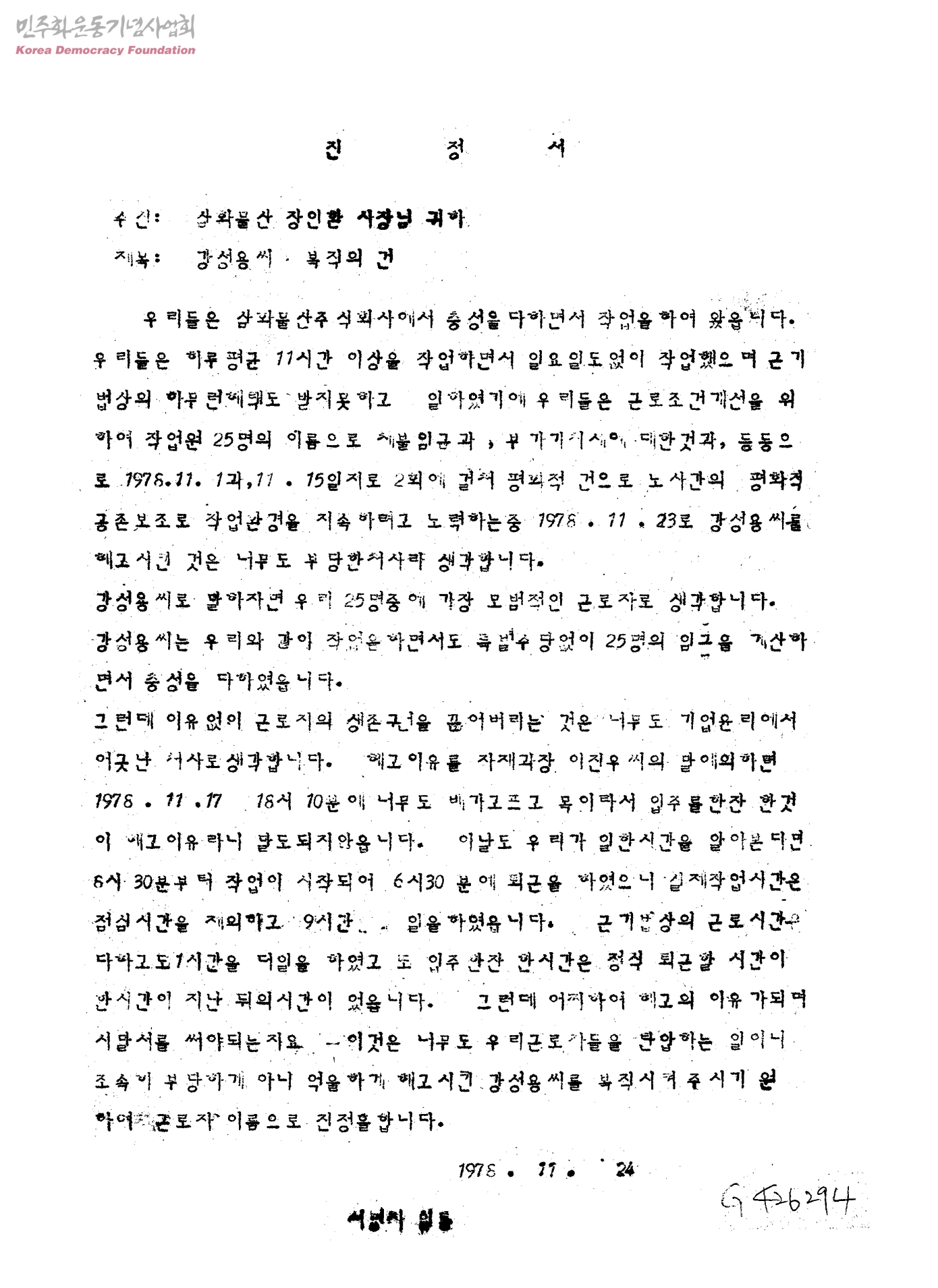 [삼화물산 관련자료]강성용씨 복직의 건[수신:장인환 사장, 발신: 송창덕 외]