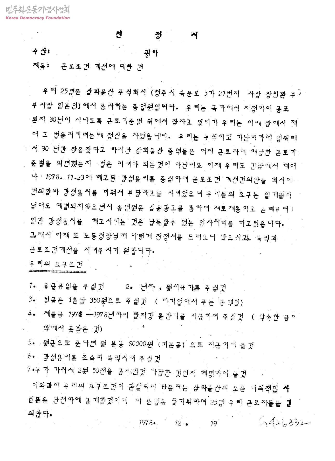 [삼화물산 관련자료][근로조건 개선에 대한 진정서]
