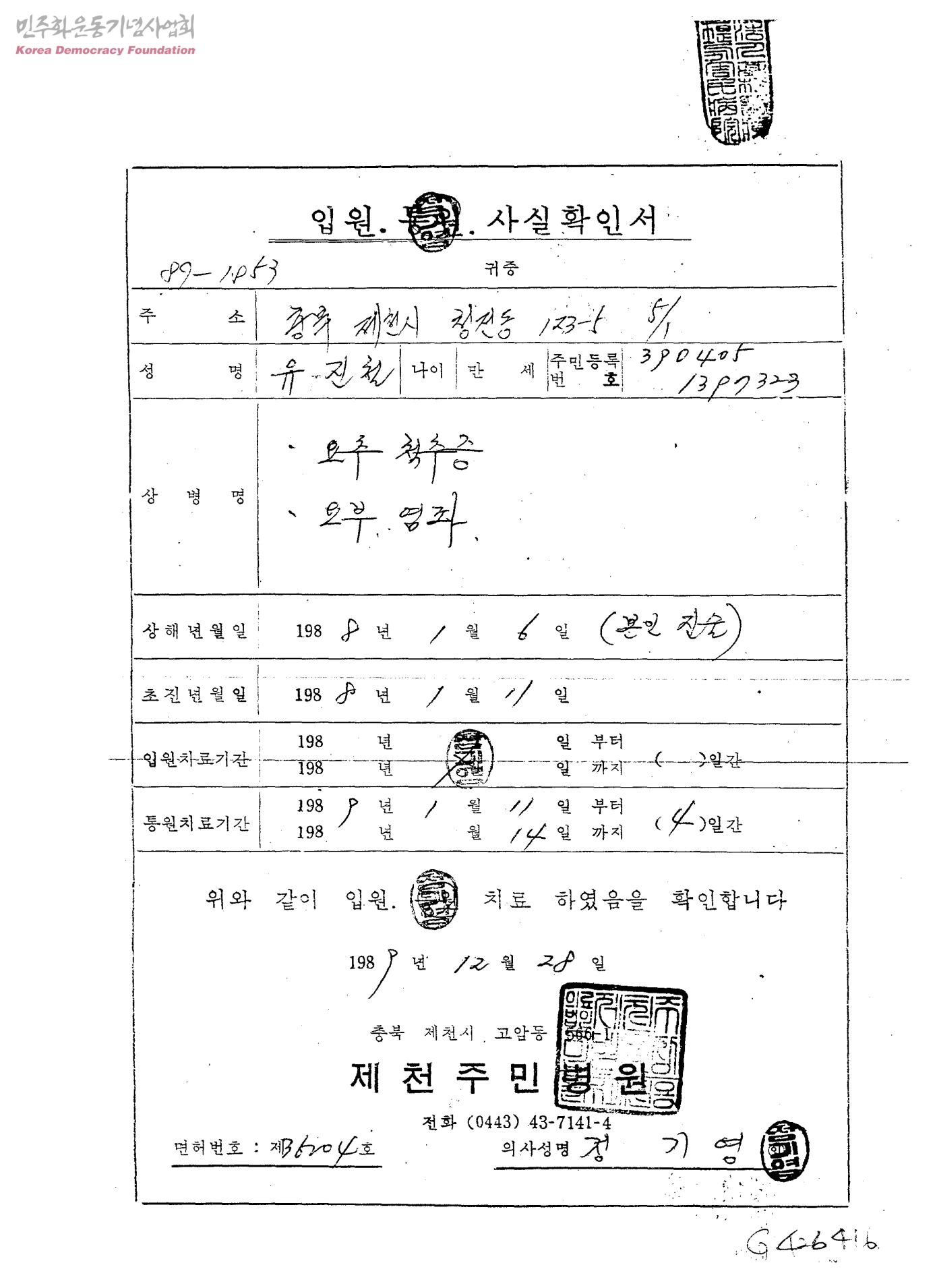 [아세아세멘투 유진철씨 관련자료][유진철의 통원 사실확인서 및 진단서]
