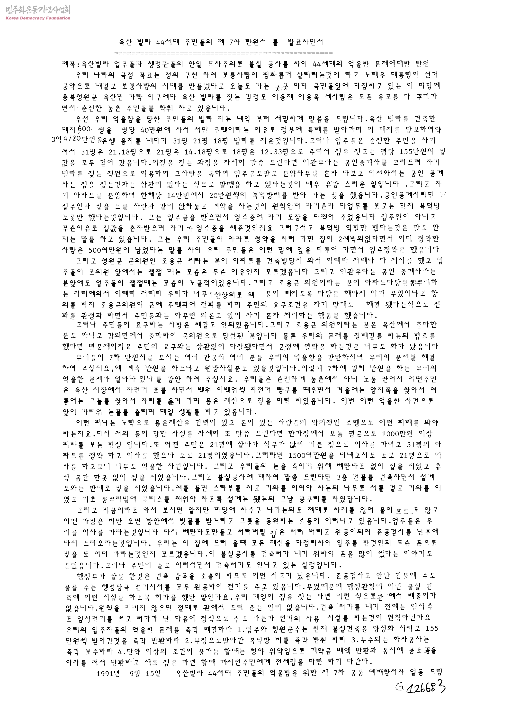 옥산빌라 업주들과 행정관들의 안일무사주의로 불실공사를 하여 44세대의 억울한 문제에 대한 탄원-옥산빌라 44세대 주민들의 제7차 탄원서를 발표하면서