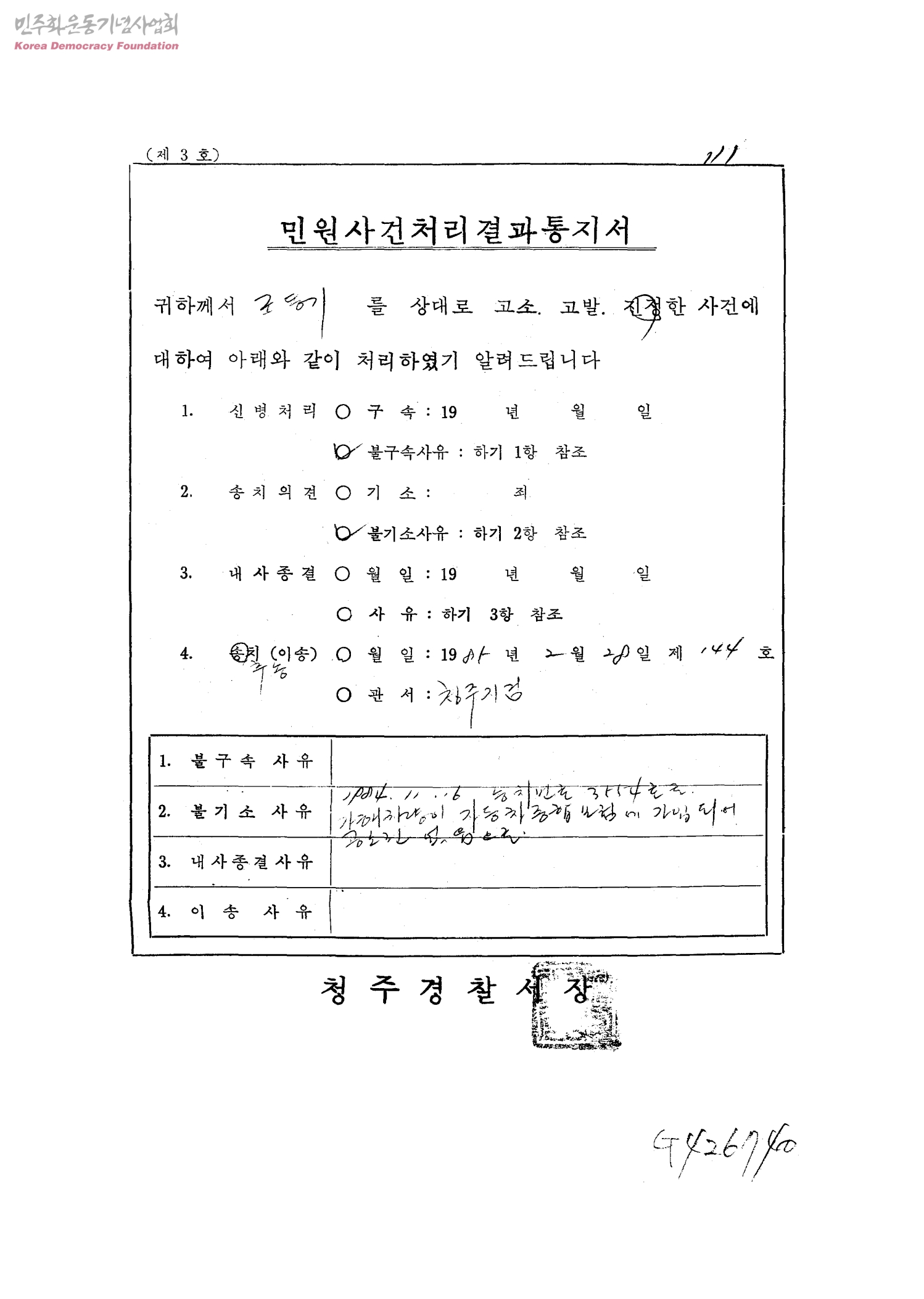 [고정철 교통사고 관련 자료]민원사건처리결과통지서[수신:고대식,발신:청주경찰서장]