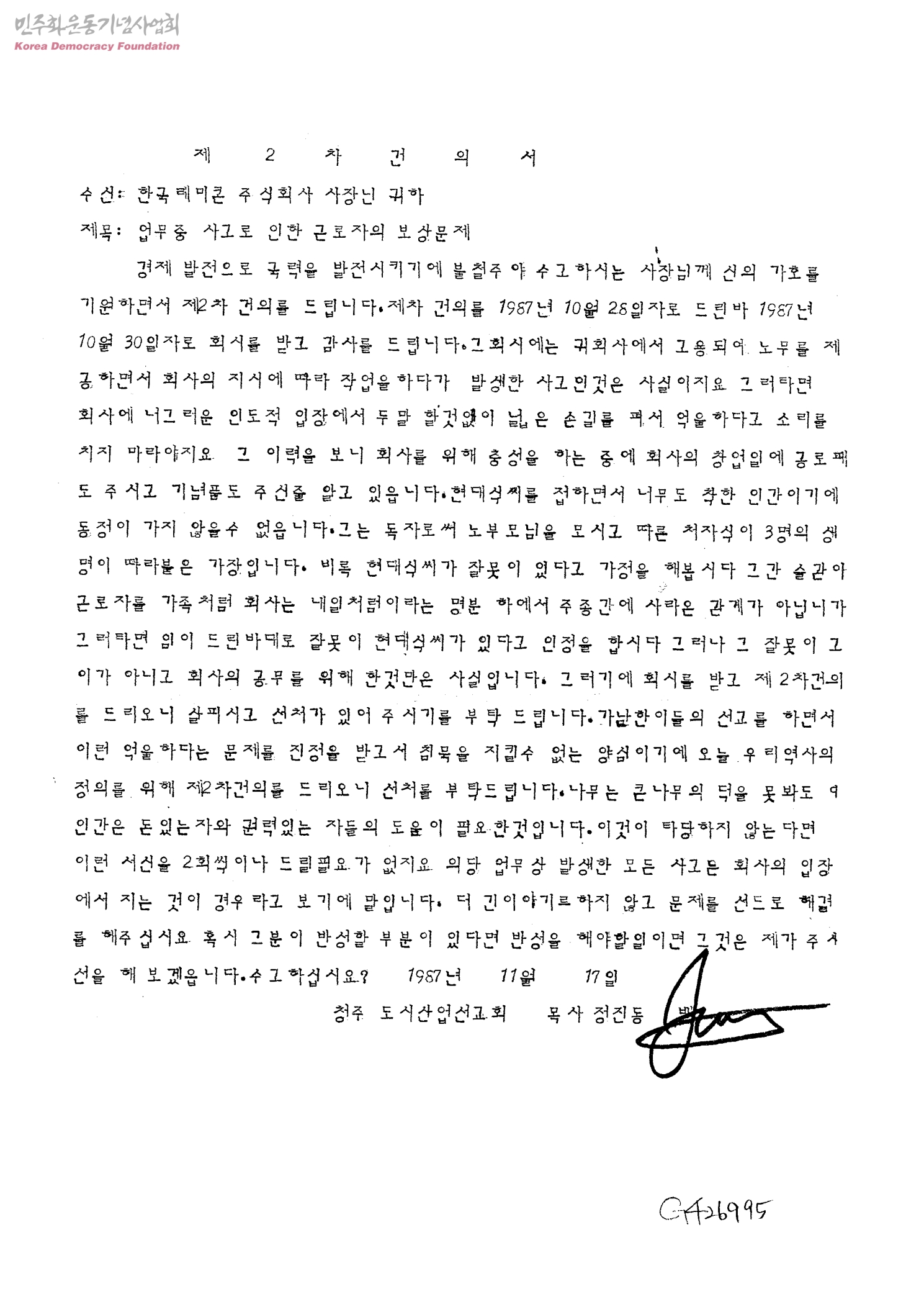 [한국레미콘 현대식씨 관련자료]업무중 사고로 인한 근로자의 보상문제[수신:한국레미콘주식회사 사장님,발신:정진동]