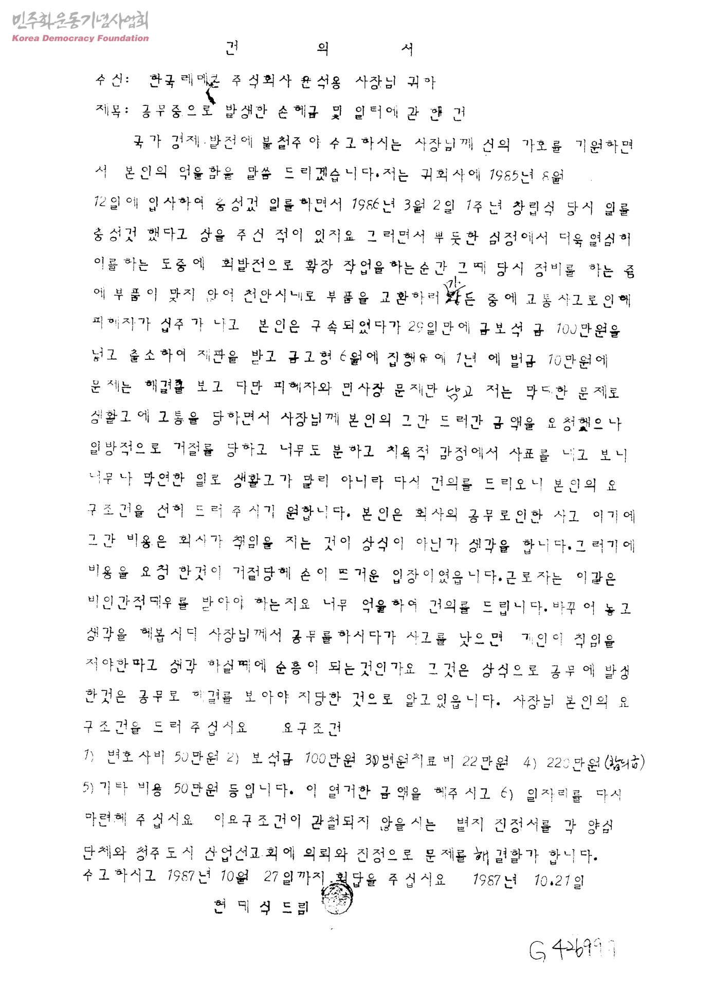 [한국레미콘 현대식씨 관련자료]공무중으로 발생한 손해금 및 일터에 관한 건[수신:한국레미콘주식회사 사장님,발신:현대식]