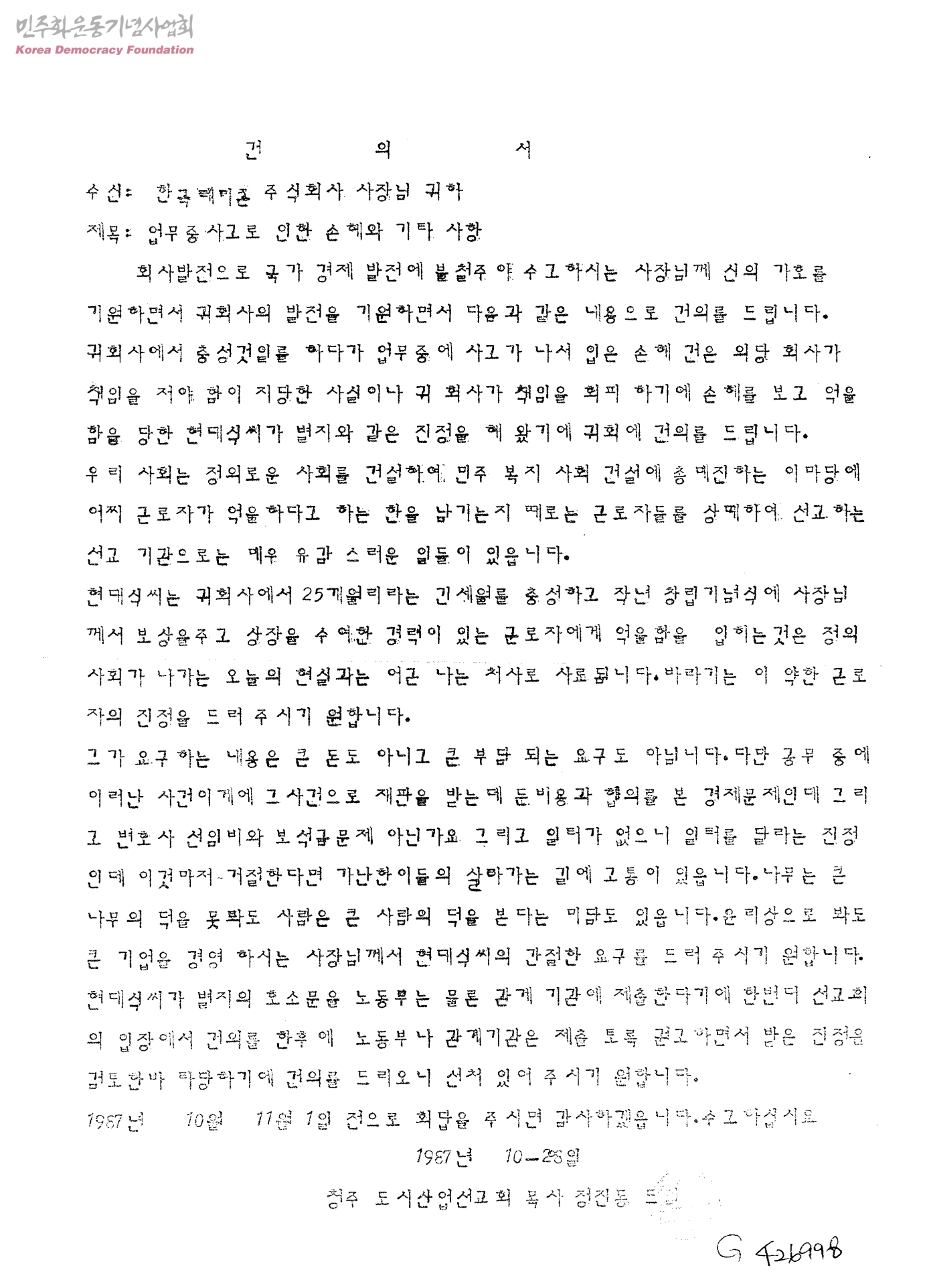 [한국레미콘 현대식씨 관련자료]업무중 사고로 인한 손해와 기타 사항[수신:한국레미콘주식회사 사장님,발신:정진동]