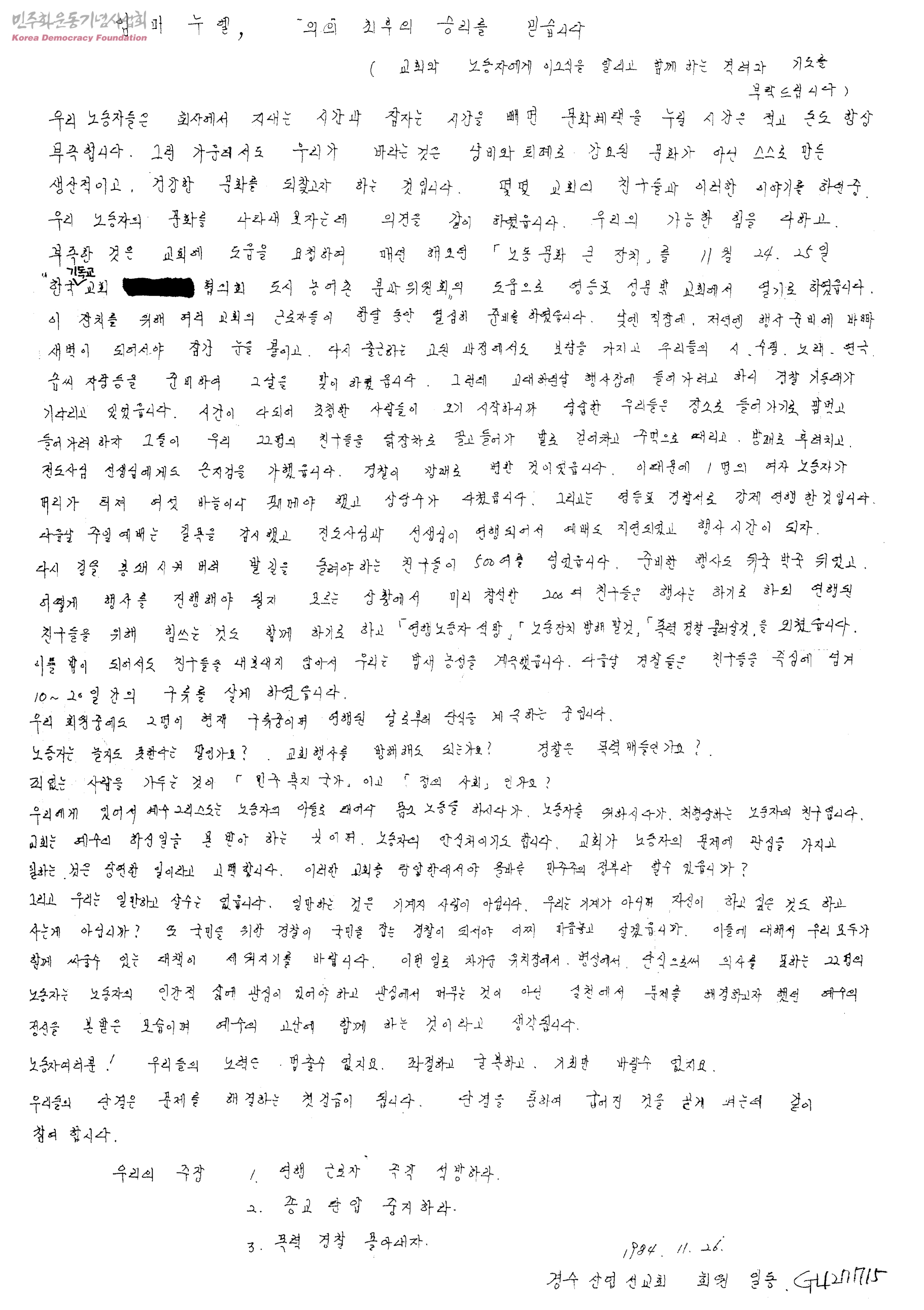 - 우리의 주장 1.연행 근로자 즉각 석방하라 2.종교탄압 중지하라 3.폭력 경찰 몰아내자