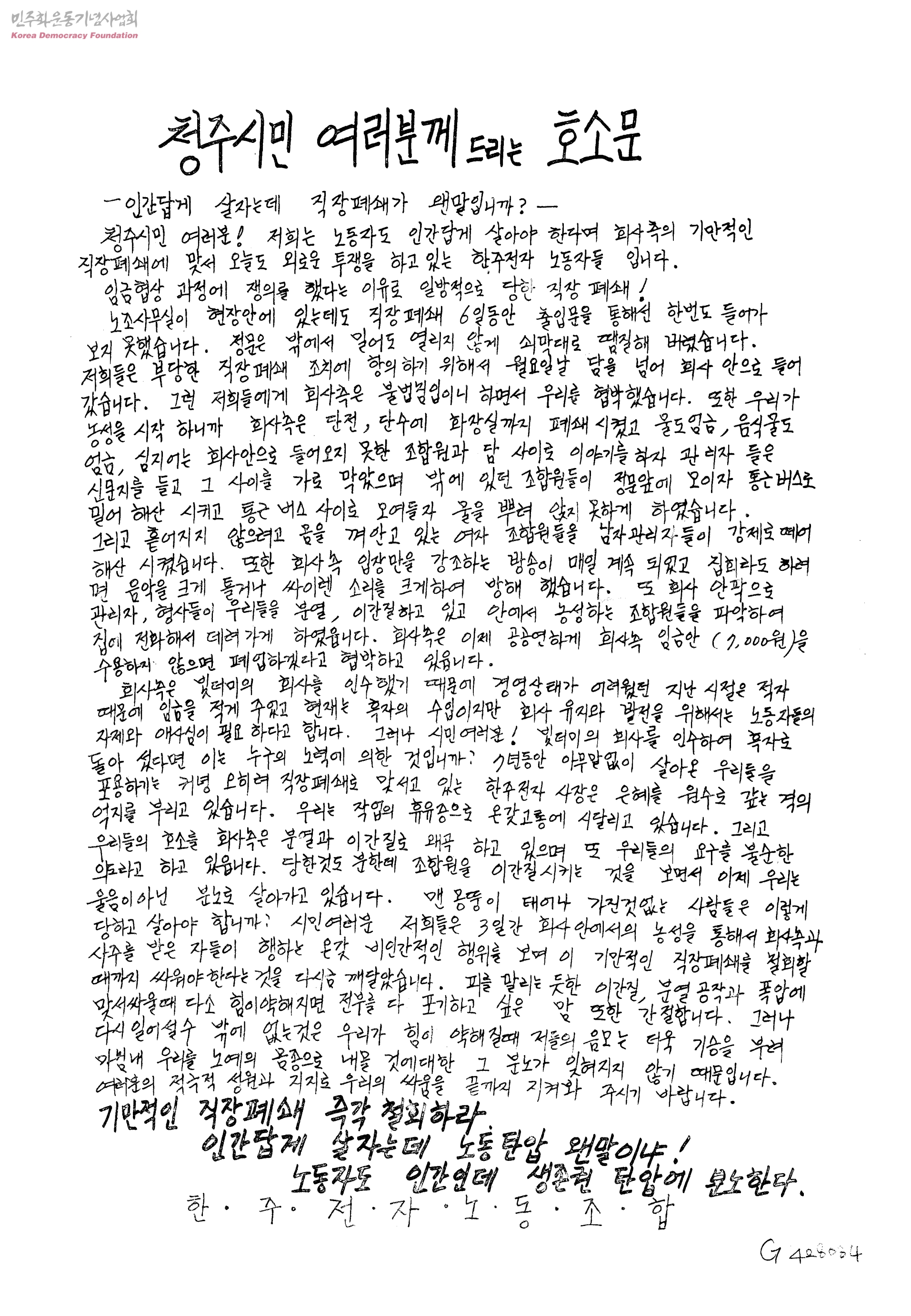 [한주전자 노조탄압 관련]청주시민 여러분께 드리는 호소문 -인간답게 살자는데 직장폐쇄가 왠말입니까-