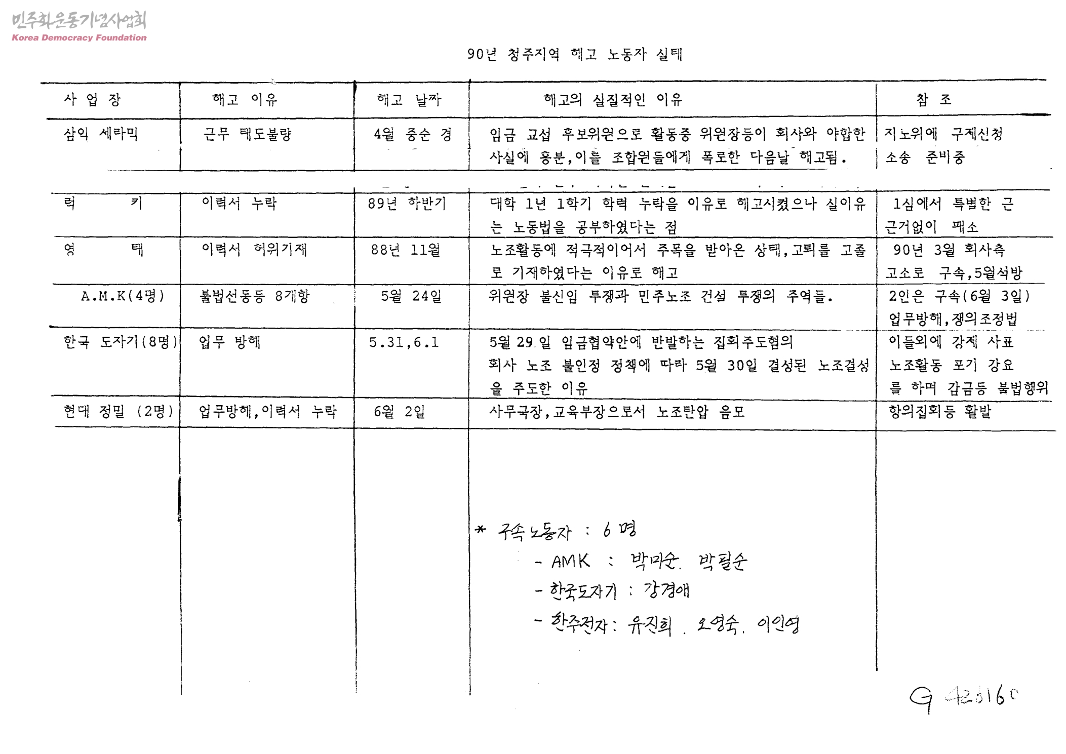 90년 청주지역 해고 노동자 실태[삼익세라믹,럭키,영태,AMK,한국도자기,현대정밀]