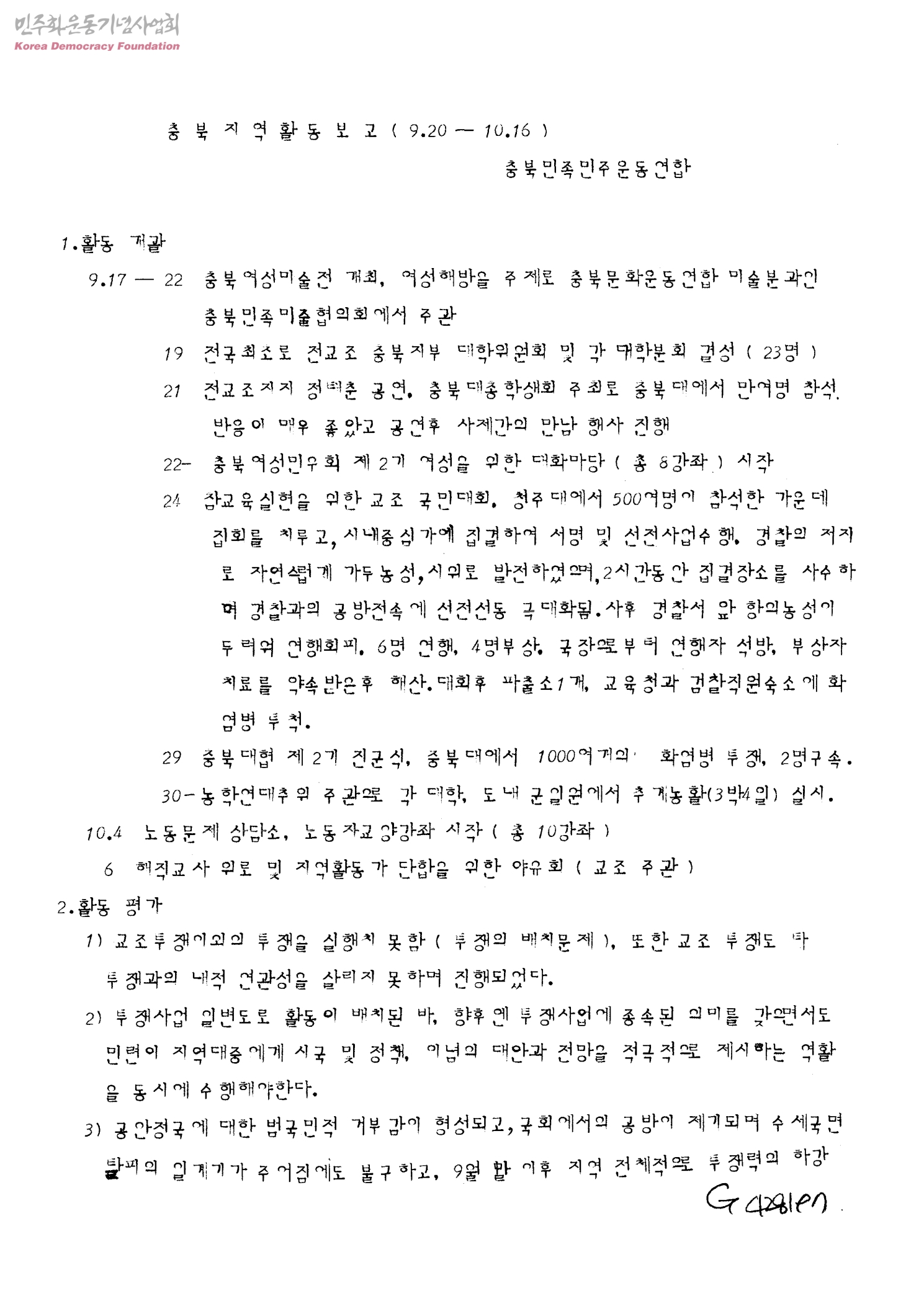충북지역활동보고(9.20-10.16)